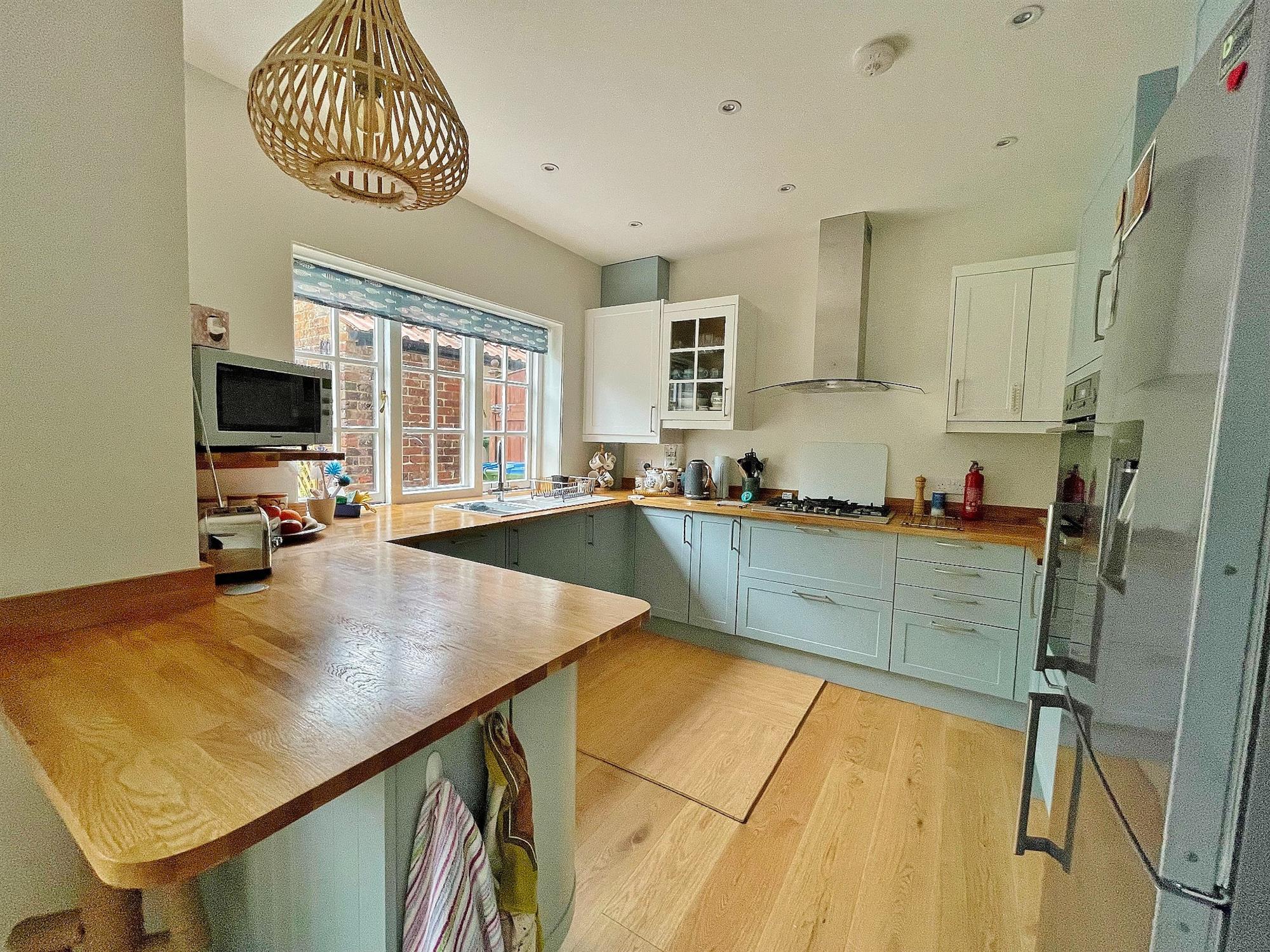 A comprehensively re-fitted range of eye and base level units with varnished oak worktop surfaces. One and a half bowl single drainer sink unit with mixer tap fitting with retracting nozzle. Integrated slimline dishwasher, built-in double oven with five burner gas hob and extractor hood. Larder style drawer storage as well as additional corner storage solutions within the base level units. Concealed wall mounted central heating boiler. Matching built-in breakfast bar. Georgian style window to rear elevation.