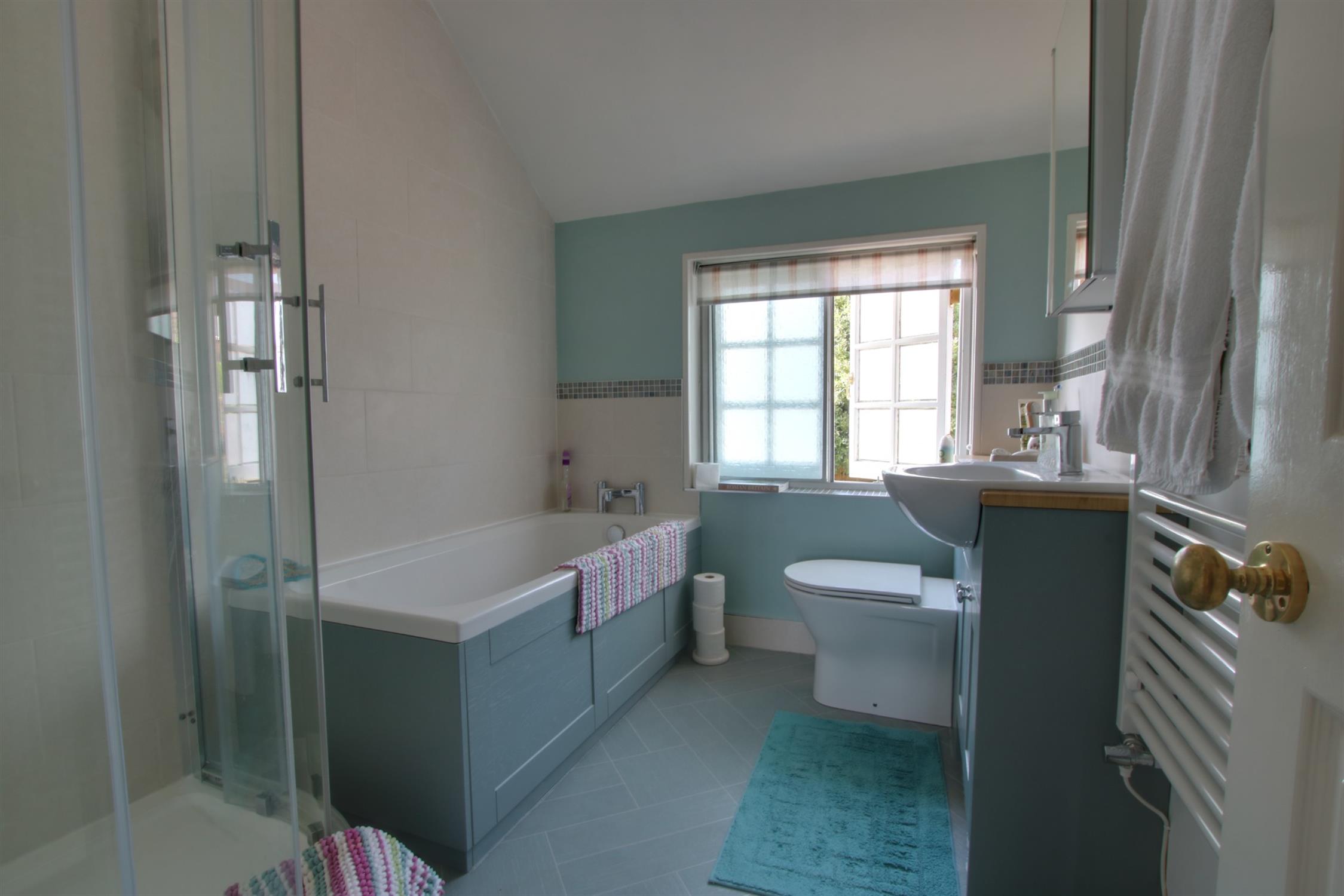 A contemporary re-fitted suite comprising; panelled bath, separate quadrant style shower enclosure with thermostatic shower, low level w.c. with concealed cistern and vanity hand basin. Partly tiled wall surfaces. Wall mounted ladder style radiator/towel rail.