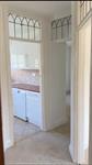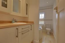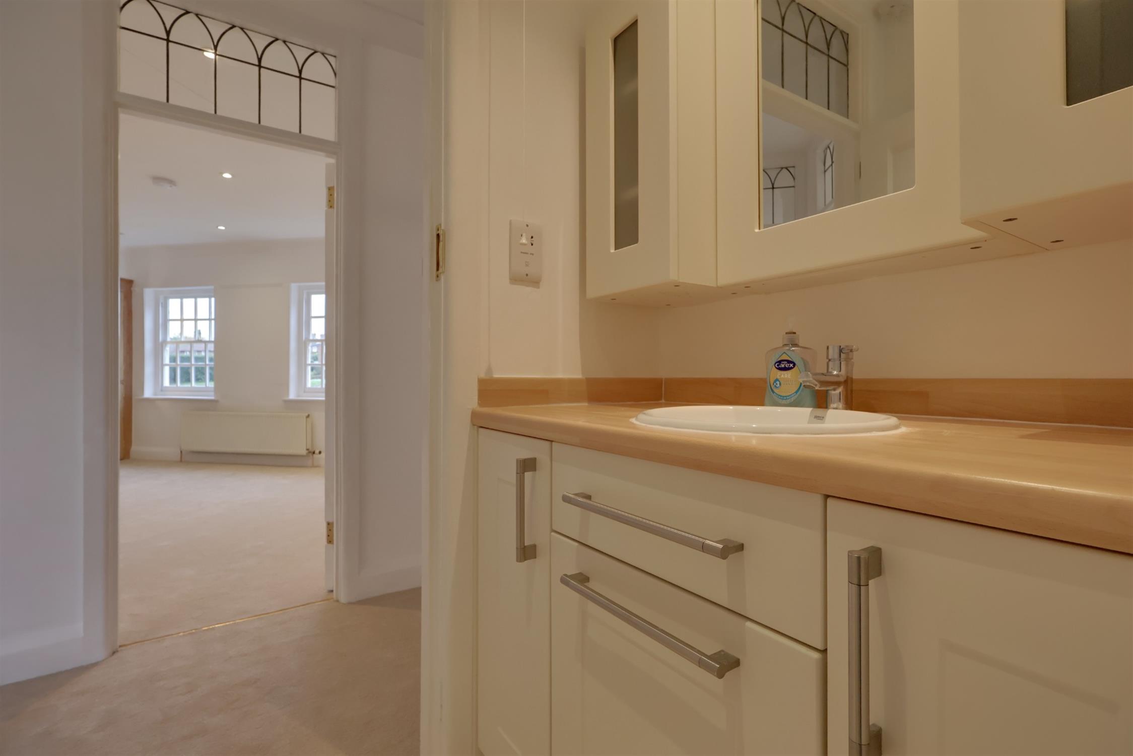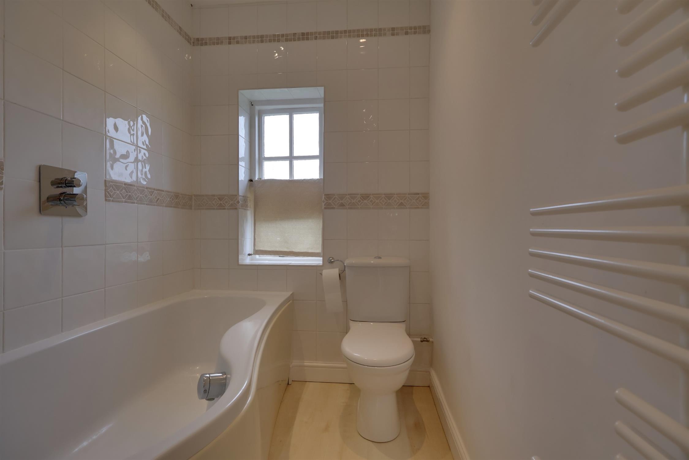 Panelled p-shape bath with screen and shower attachment, w.c. and ceramic sink with cupboard under. Heated towel rail. Original window.