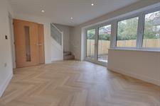 Double glazed double doors and window leading to rear elevation. Smooth plastered ceiling with recessed lighting. Stairs rising to first floor with glazed balustrade. Under stairs storage cupboard housing underfloor heating manifold. Smooth plastered ceiling with recessed lighting. Herringbone style wood effect flooring.