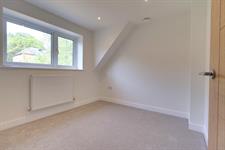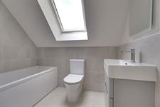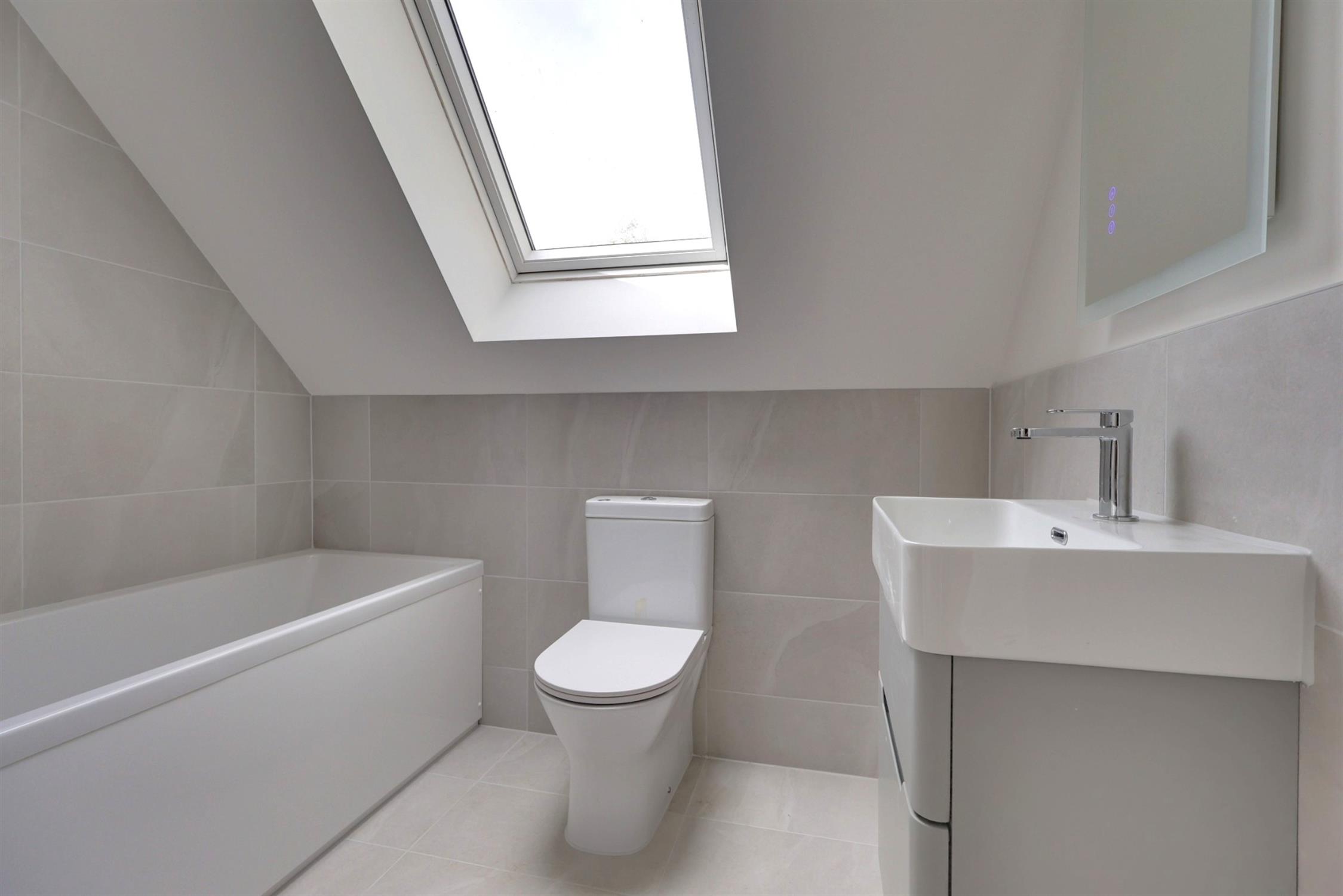 Contemporary fitted suite comprising; panelled bath with rainfall style shower over, low level w.c. and vanity hand basin. Ladder style radiator/towel rail combination. Partially tiled walls. Velux style double glazed window.