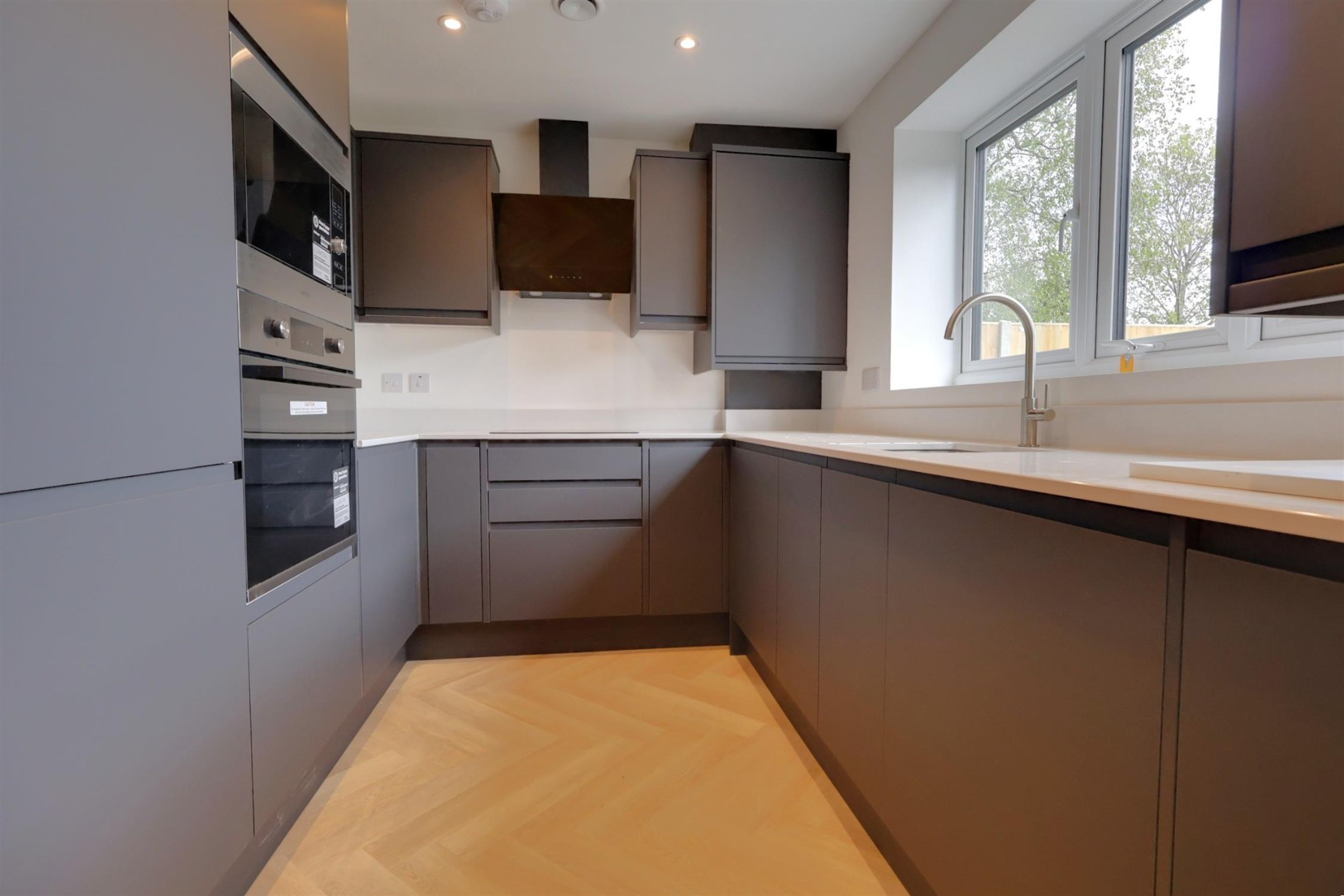 Fitted in a contemporary style, the kitchen offers a range of eye and base level units to include an underlaid sink with built-in oven as well as microwave with hob and extractor hood over. Integrated washer/dryer, dishwasher and fridge/freezer The kitchen is trimmed with matching worktops and up-stands. Double glazed window to front elevation. Smooth plastered ceiling. Partially glazed internal door. Herringbone style flooring.