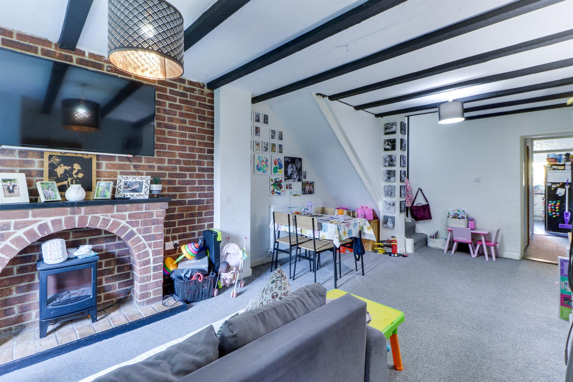 Tucked away in a peaceful setting, this two-bedroom period home offers an appealing blend of character and comfort. Set well back from the road, it enjoys a wonderfully private position with generous front and rear gardens, ideal for those who appreciate a quiet and green outlook. The ground floor features a bright, open-plan living and dining area with exposed beams and a feature brick fireplace, creating a cosy yet spacious feel. To the rear, a kitchen provides plenty of storage and workspace, with a pleasant view over the rear garden. A ground floor bathroom completes the ground floor accommodation.