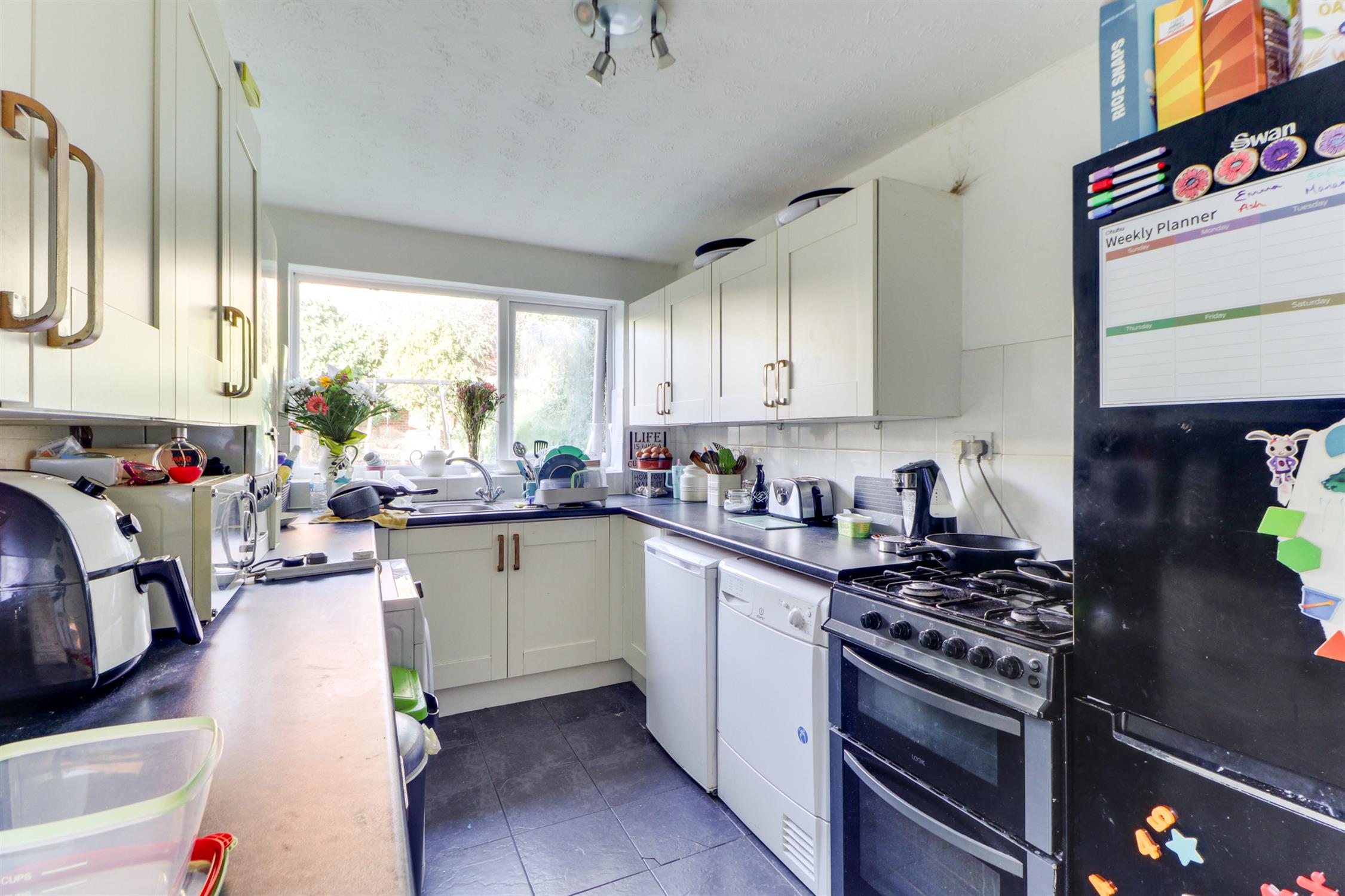 Textured ceiling, UPVC double-glazed window, door to garden, a range of wall and base-mounted units with roll-top work surfaces over, inset sink and drainer, tiled splash back, gas cooker, space for appliances, and tiled flooring.