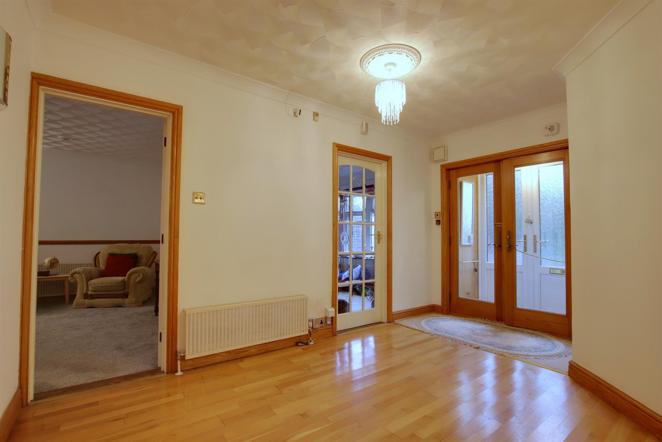 Double glazed double doors. Access to part boarded loft with telescopic ladder and power and light. Two radiators. Doors to: