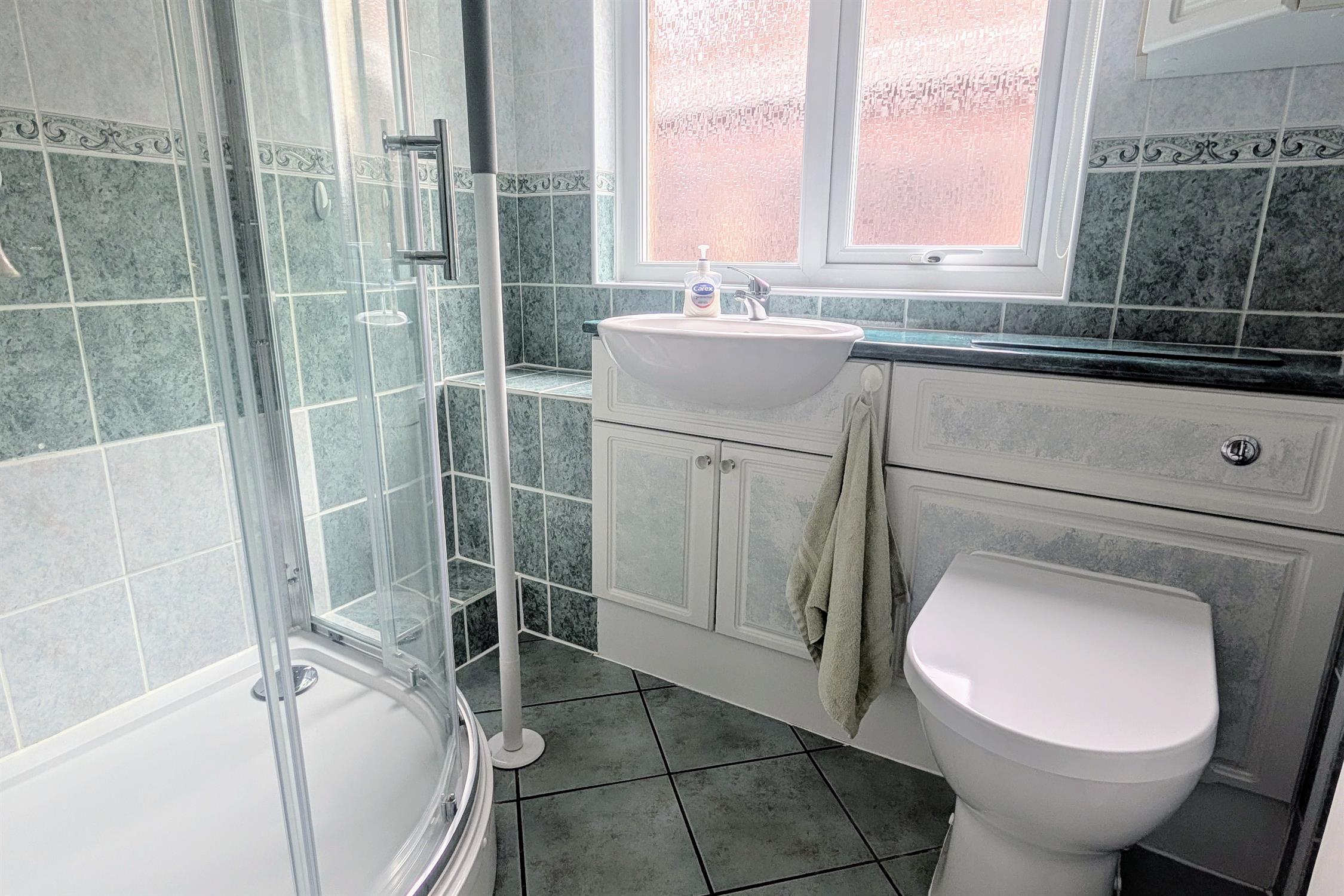 Double glazed window to side elevation. Quadrant shower cubicle. Vanity unit with wash hand basin and storage beneath. Low level close coupled WC. Tiled walls. Extractor fan.