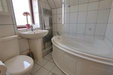 Double glazed window to rear elevation. Corner bath with shower unit over and shower screen. Low level close coupled WC. Pedestal wash hand basin. Tiled walls and floor. Heated chrome towel rail.