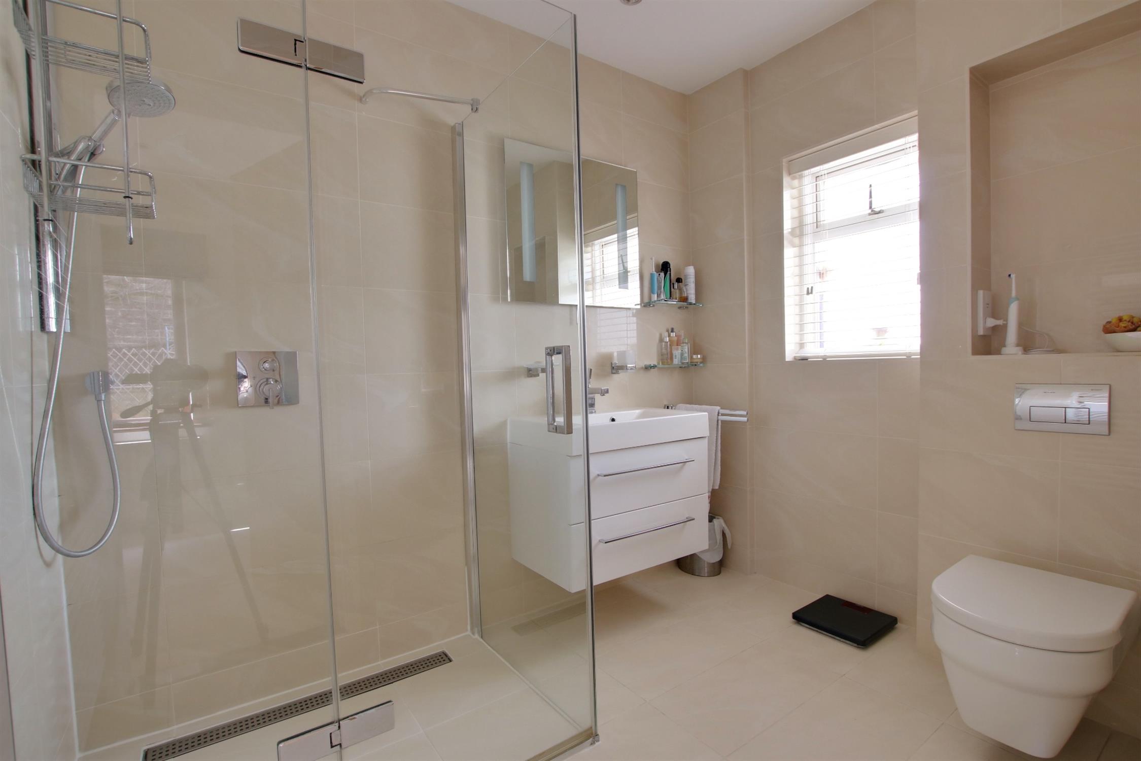 Double glazed window to rear elevation. Walk-in shower cubicle. Vanity unit with wash hand basin with drawer units below. Low level WC with enclosed cistern. Tiled floor with underfloor heating. Heated towel rail. Inset ceiling spotlights.