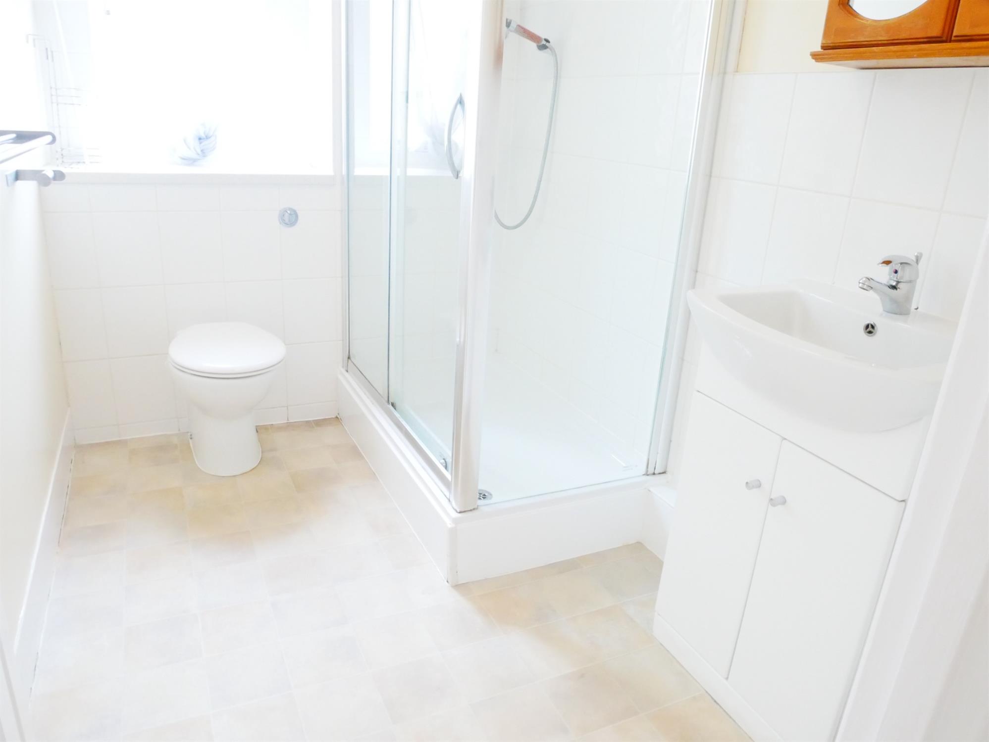 SHOWER ROOM – White suite which includes shower cubicle, sink and toilet. Window.