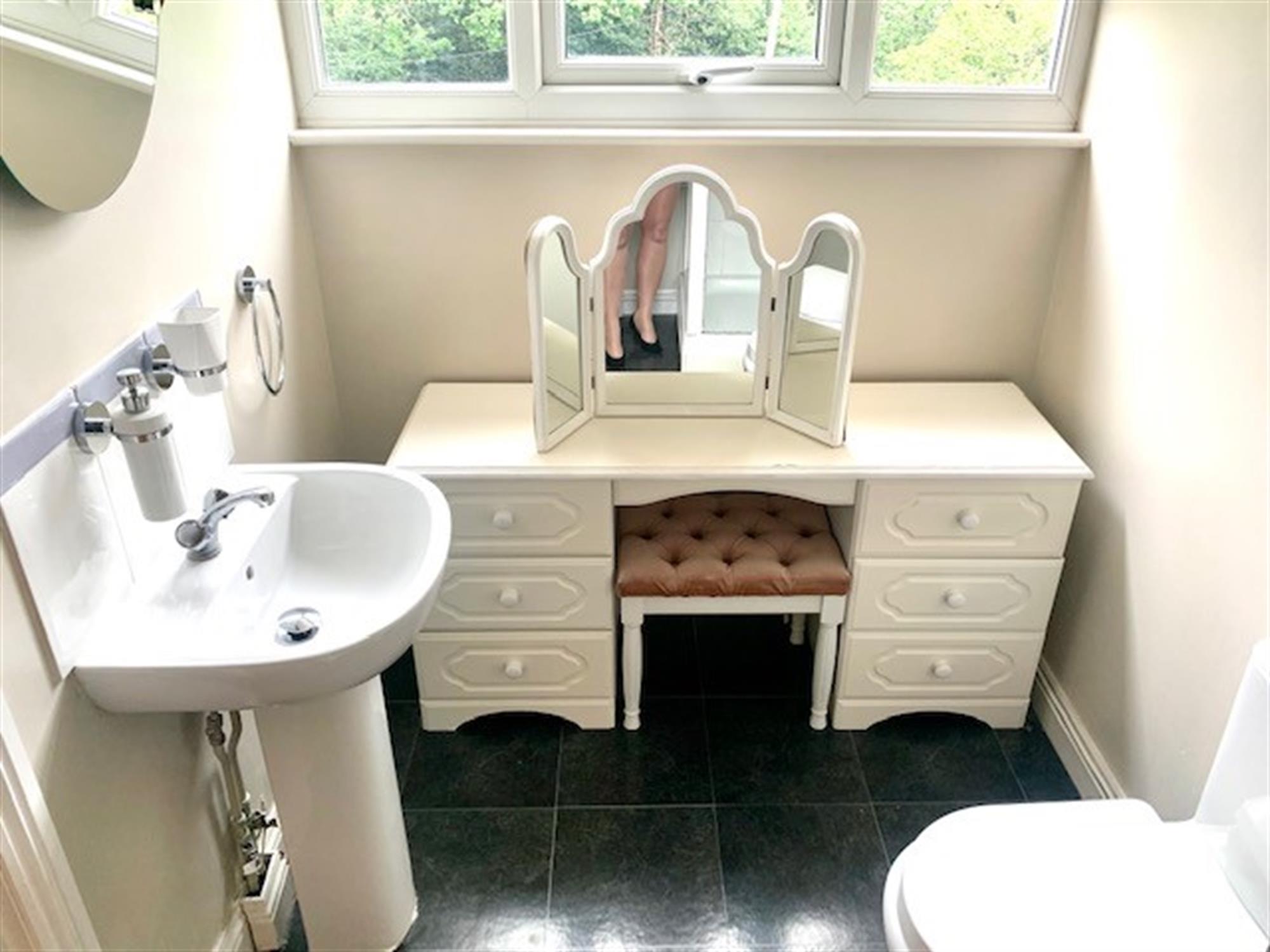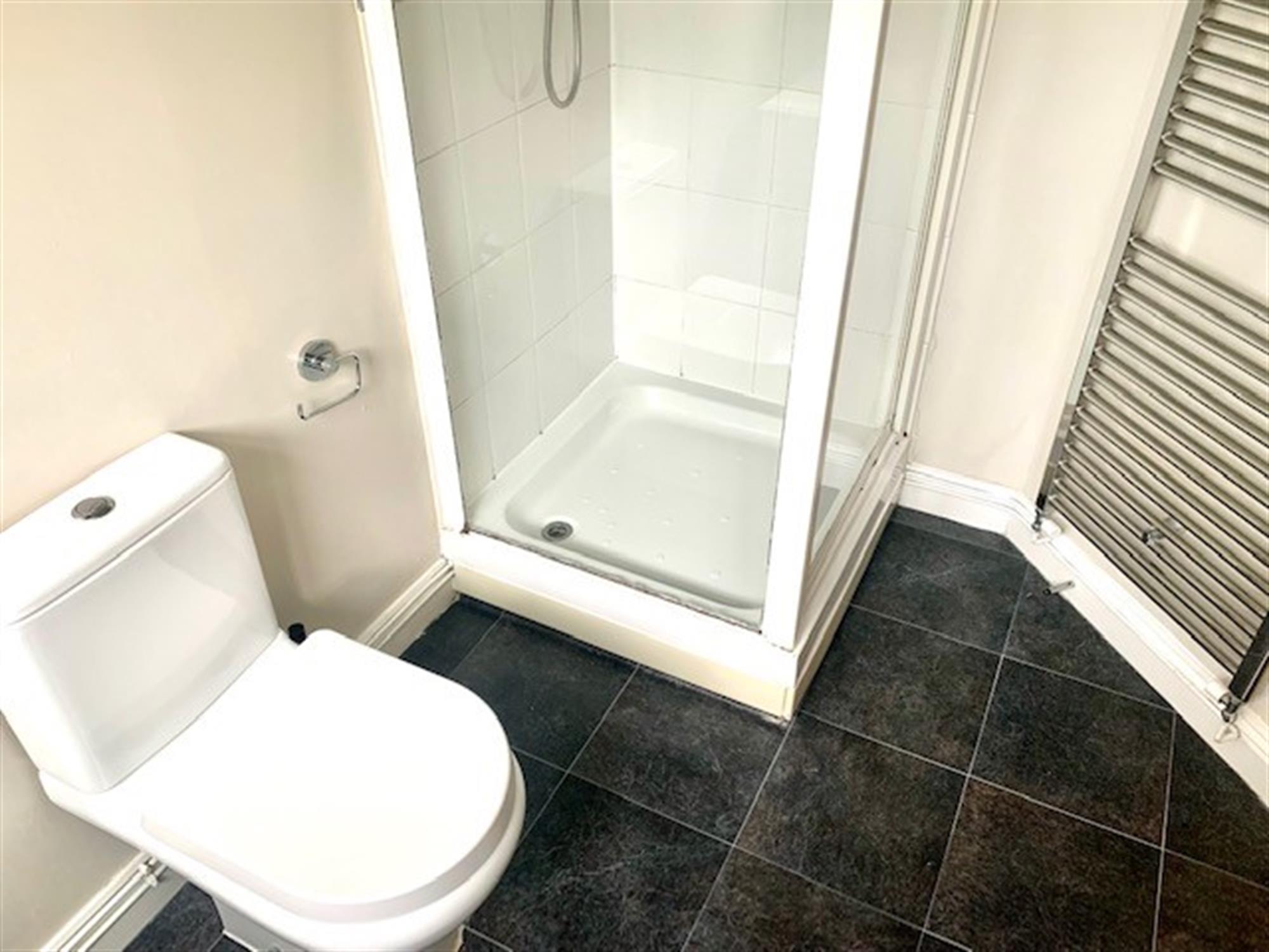 White suite with window to front. Corner shower cubicle, sink and WC.