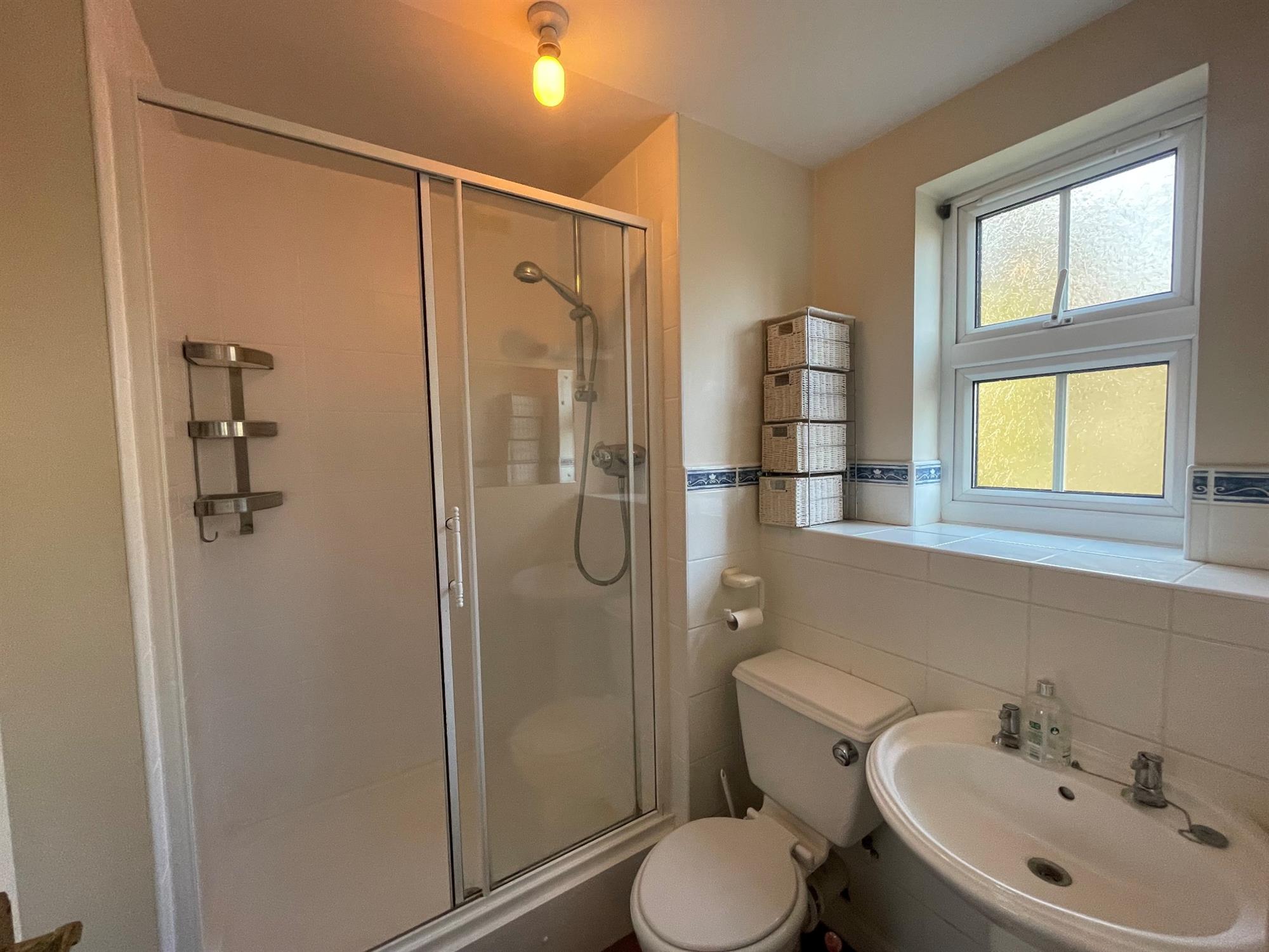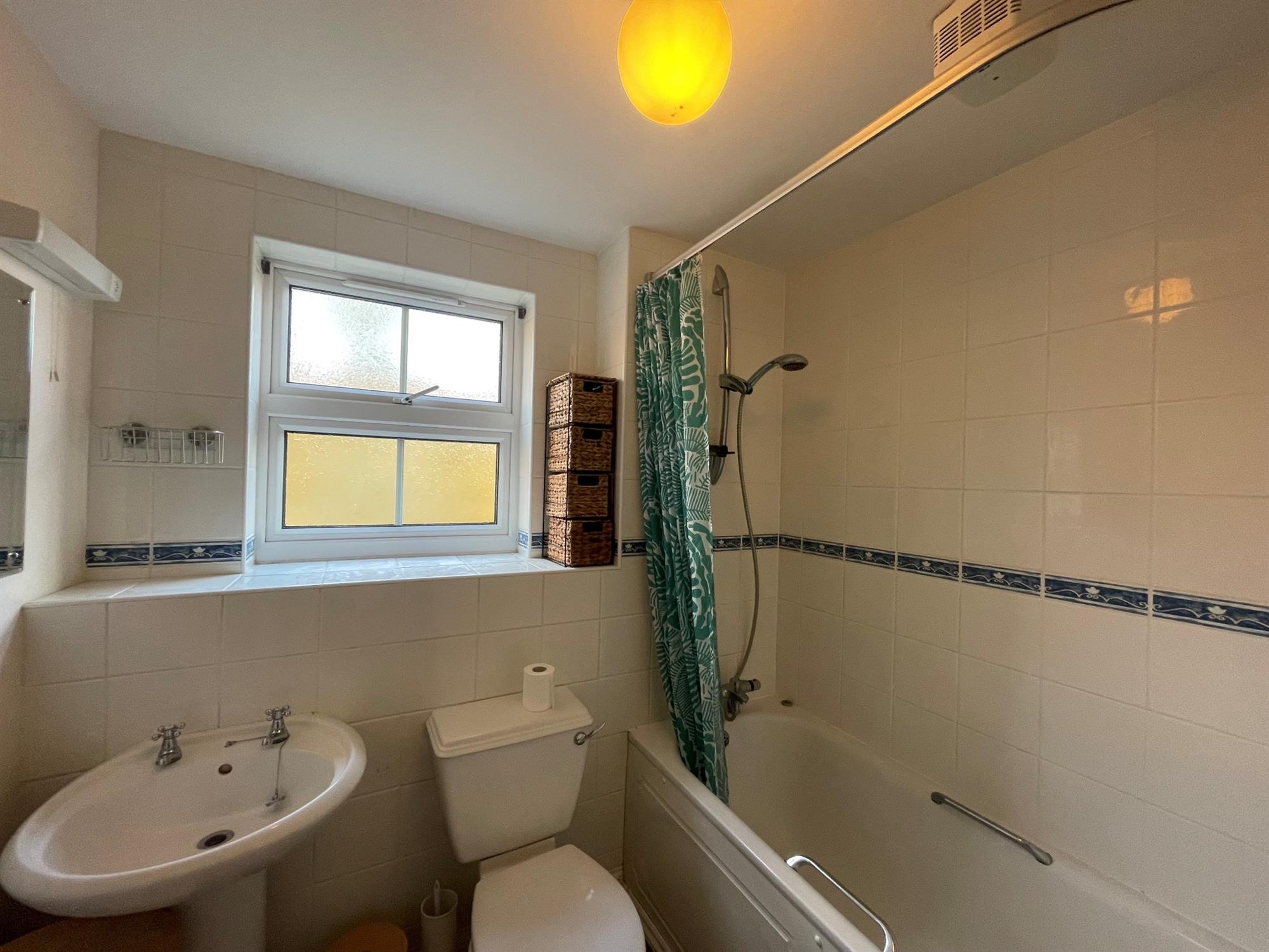 BATHROOM:- White suite with shower over bath, sink and toilet. Window to rear.