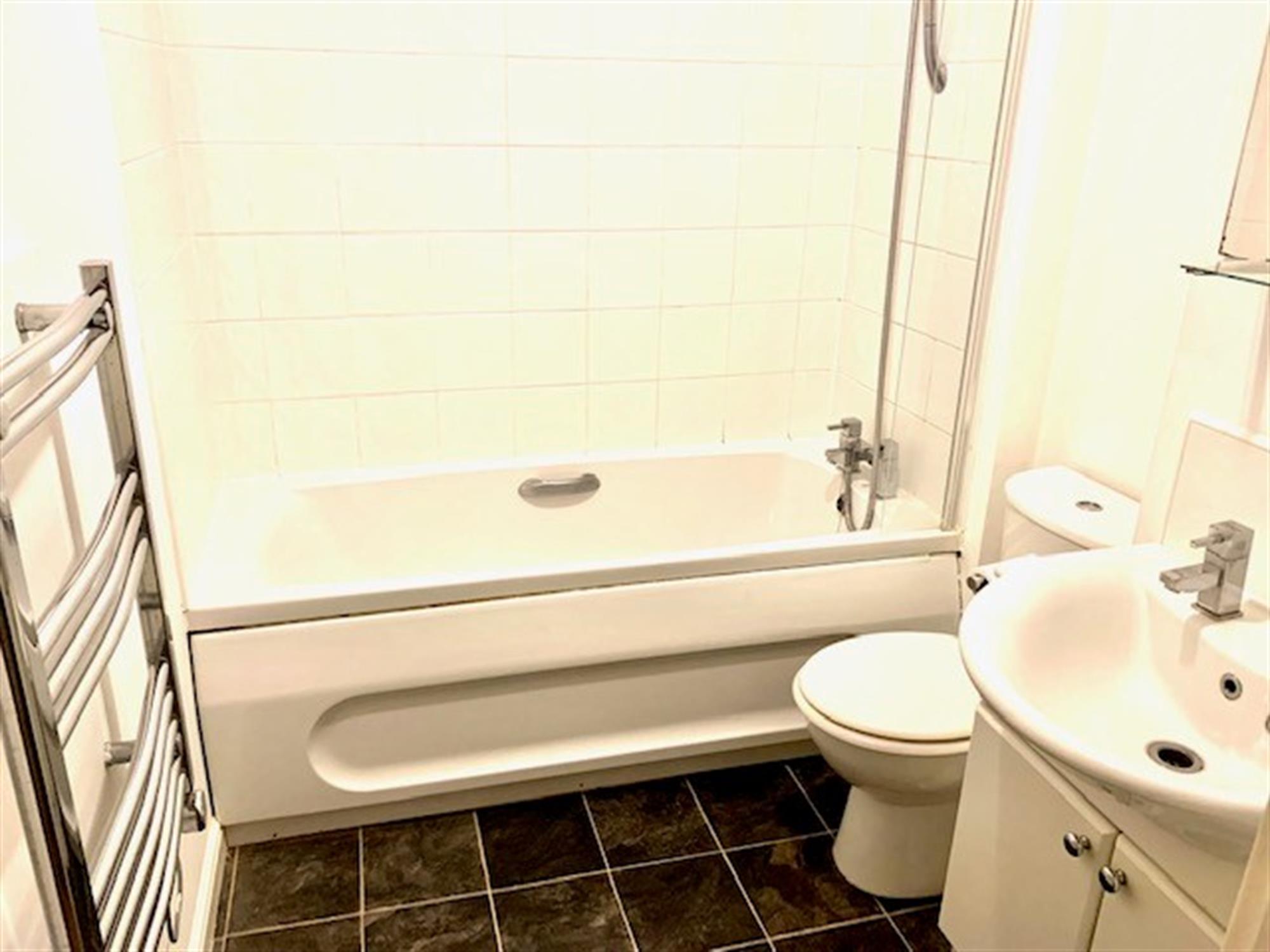 BATHROOM - Modern three piece suite with WC, hand basin and shower attachment over the bath.