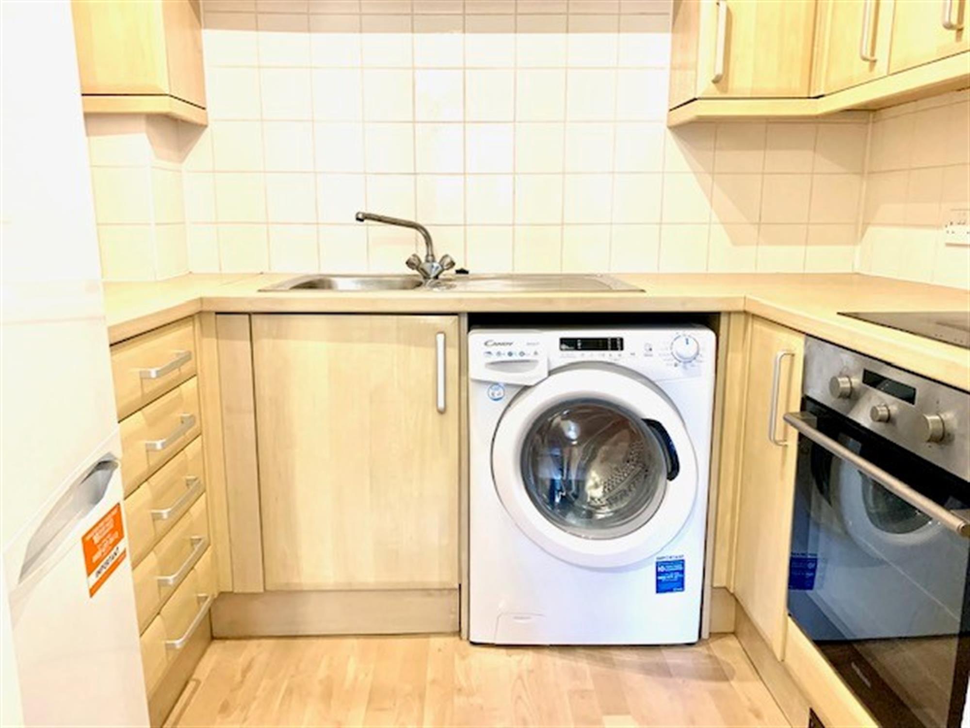KITCHEN - Range of units and white goods including electric oven/hob, washer/dryer and fridge/freezer.