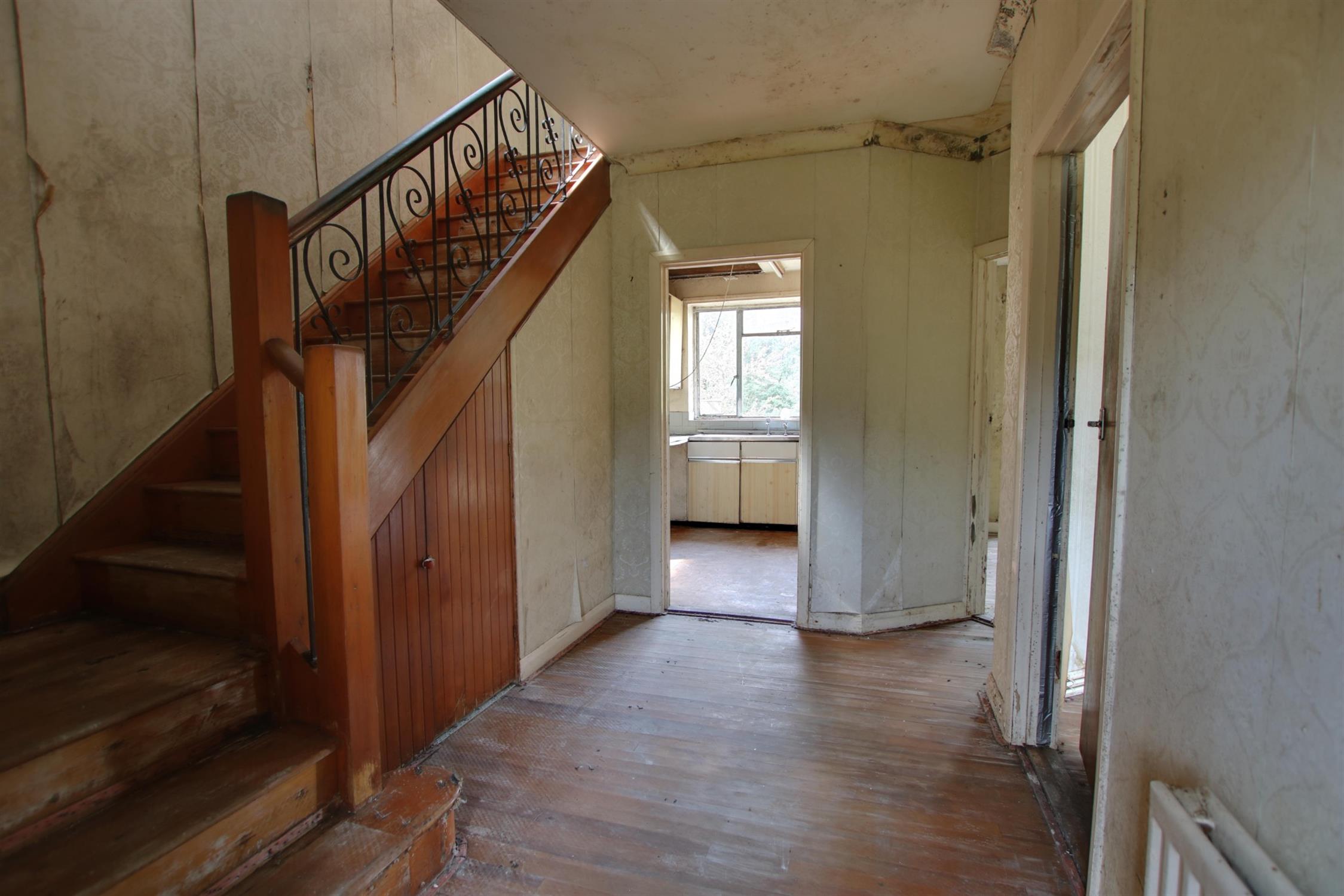 Stairs to first floor. Under stairs storage cupboard. Radiator. Doors to all rooms.