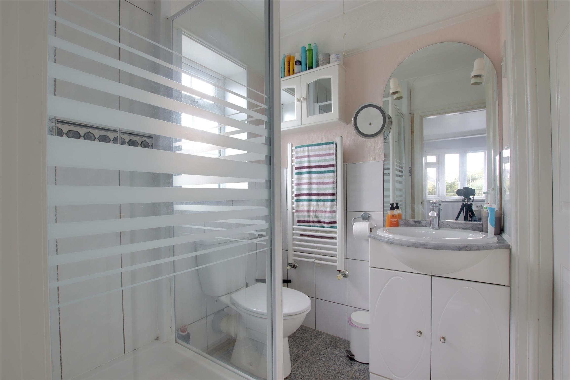 Double shower cubicle. Low level close coupled WC with enclosed cistern. Wash hand basin with cupboard under. Storage recess. Coved and textured ceiling.