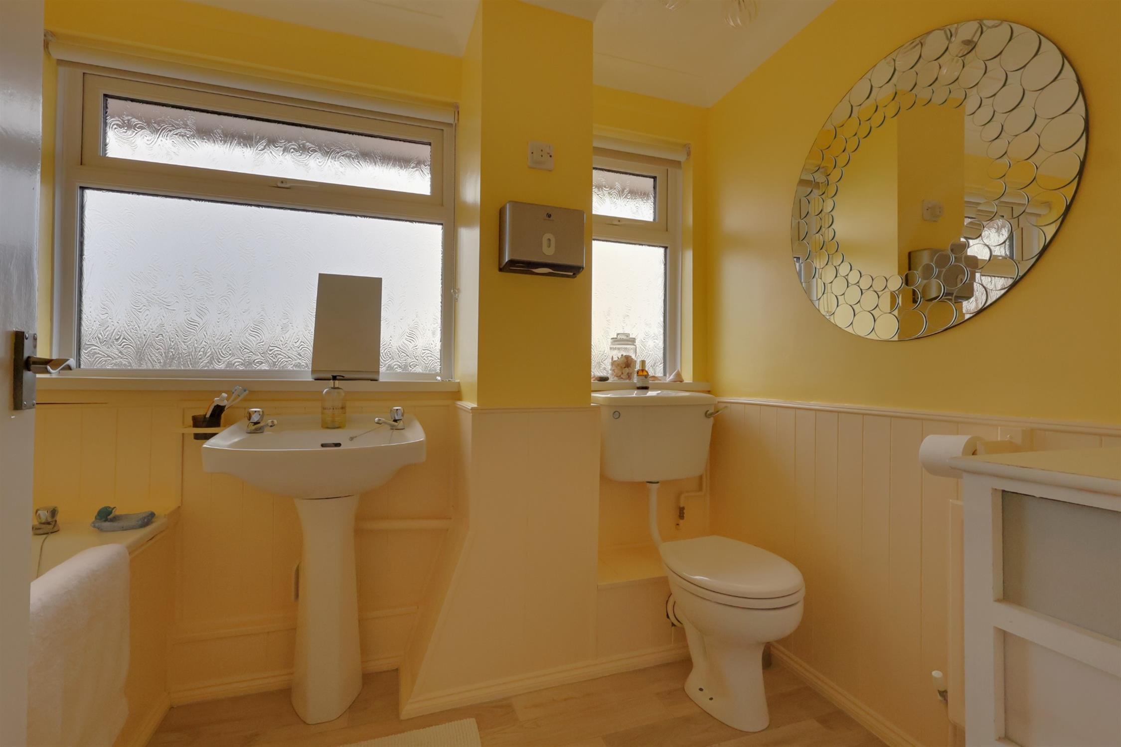 Panelled bath. WC. Ceramic sink. Radiator. Two frosted double glazed windows.