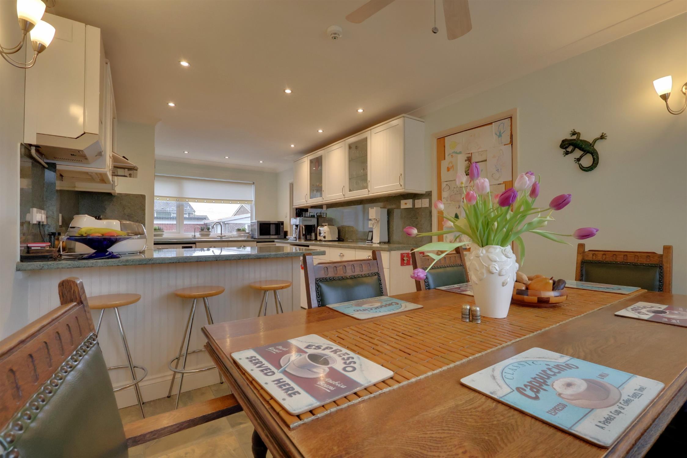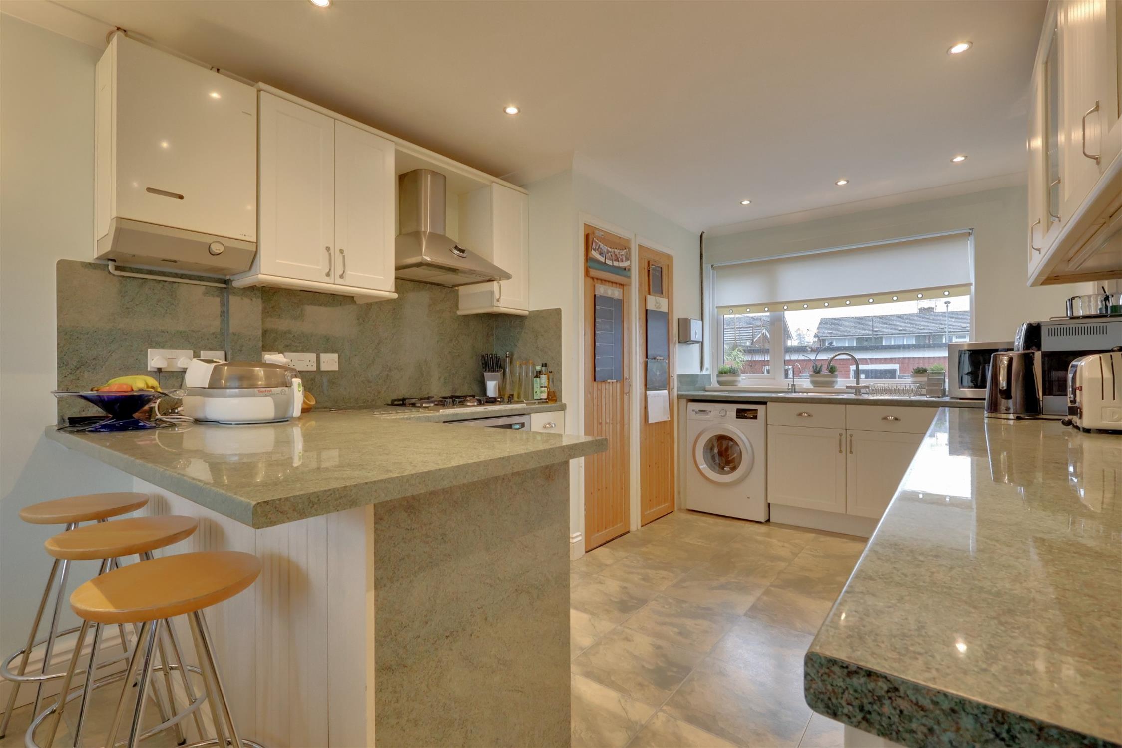 A range of wall and base cupboards with work surface over. Integrated oven. Inset one and a half stainless steel sink unit with drainer. Plumbing for washing machine and dishwasher. Space for fridge and tumble dryer. Four ring gas hob with extractor fan over. Breakfast bar. Radiator. Two double glazed windows.