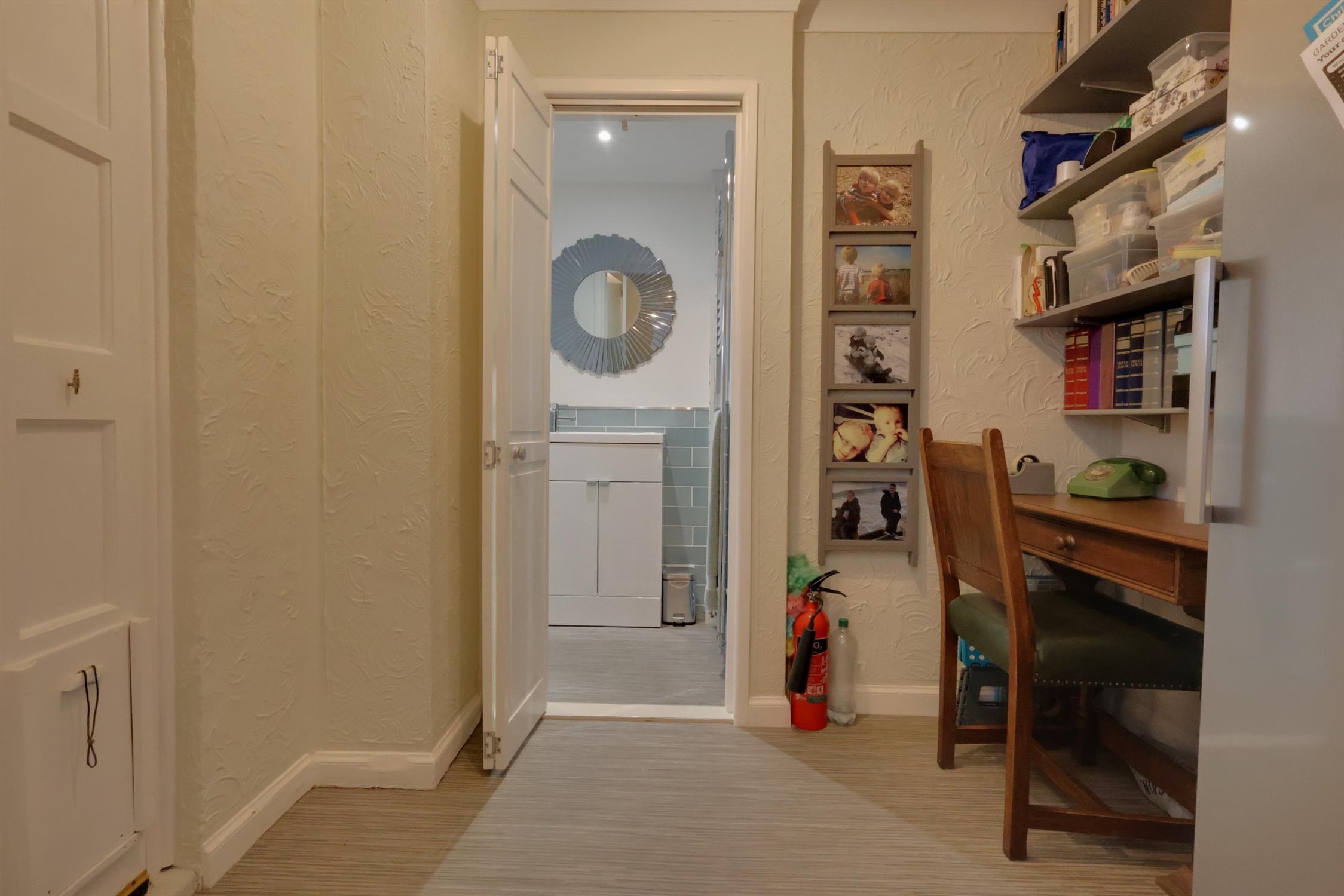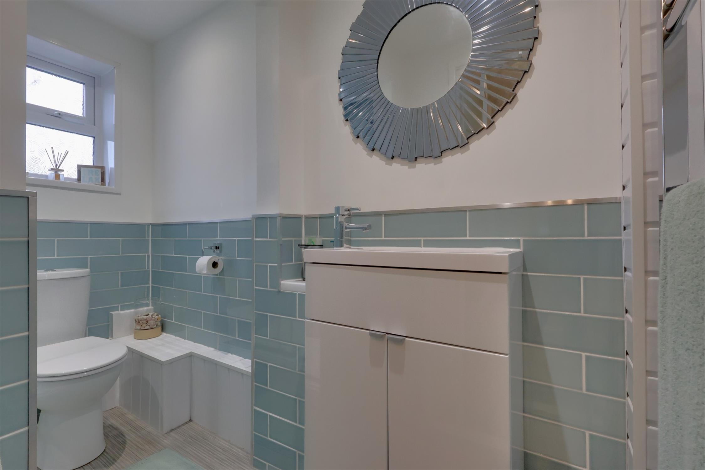Shower cubicle. WC. Ceramic sink with cupboard under. Heated towel rail. Frosted double glazed window.