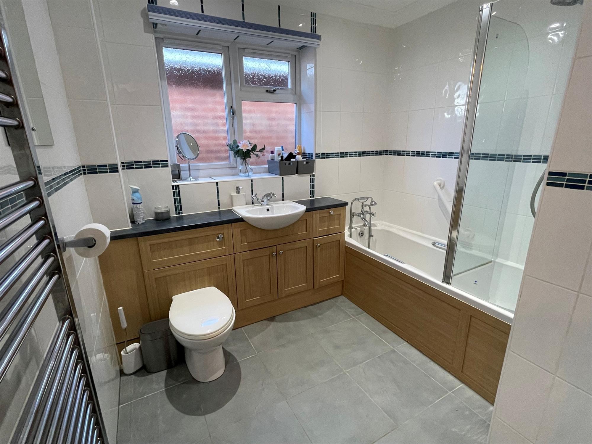 Window to side. Panelled bath with telephone style mixer tap. Low level WC with concealed flush. Inset wash hand basin with cupboards below. Complementary tiling. Heated towel rail.