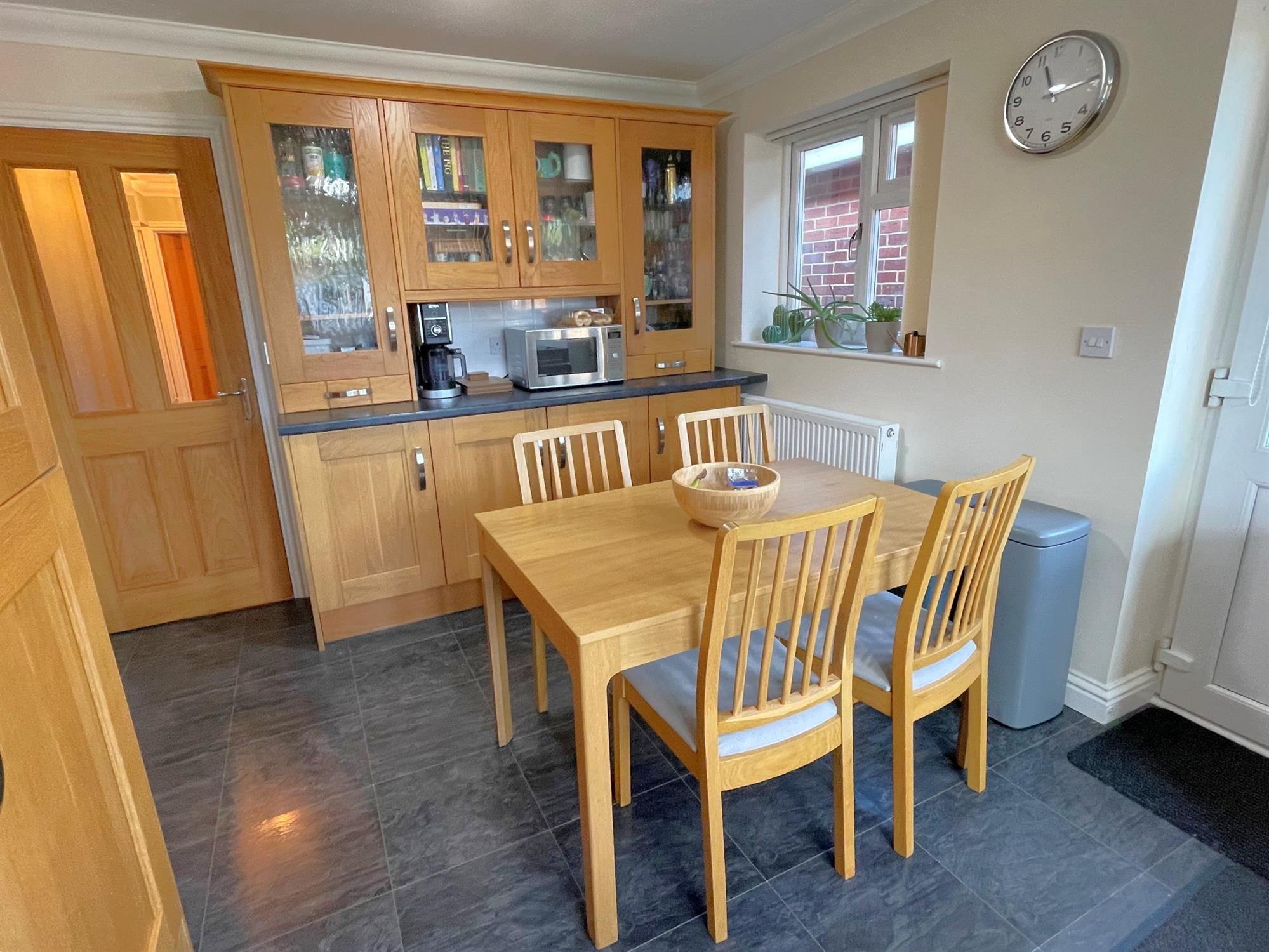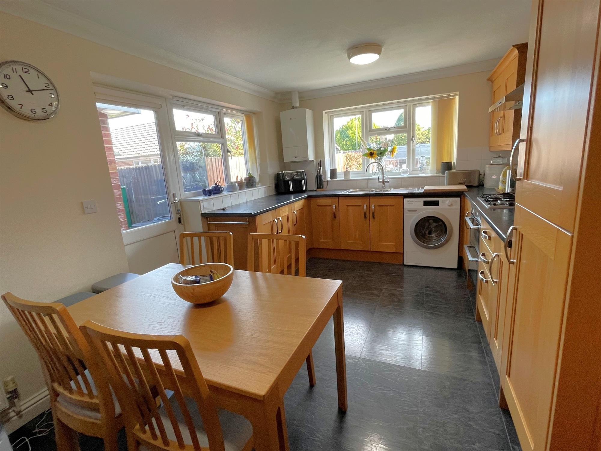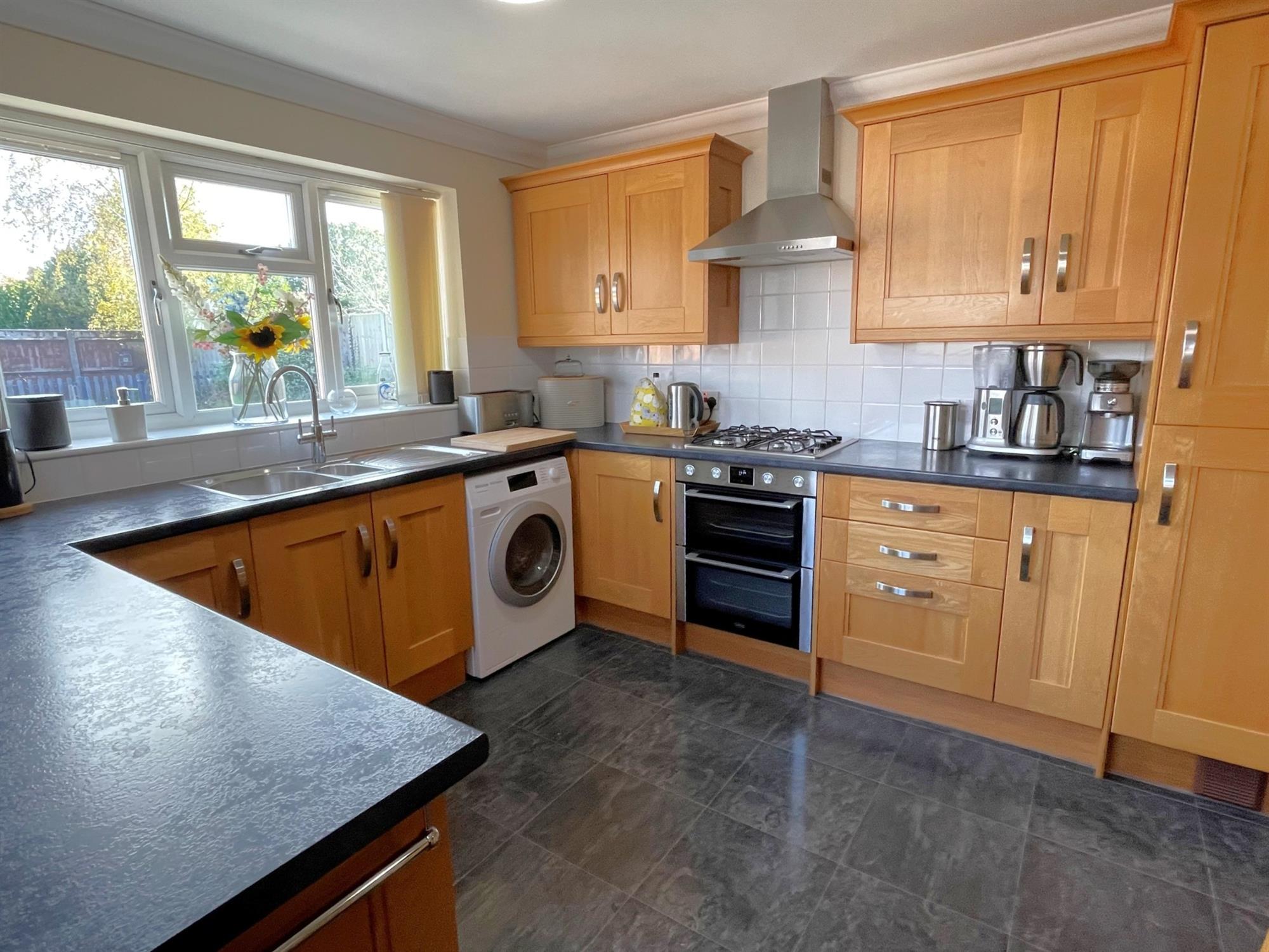 Windows to side and rear. Range of wall, base and drawer units with working surfaces over. One and a half bowl stainless steel sink unit. 4 ring gas hob with extractor over. Built-in double electric oven. Tiled splashbacks. Integrated fridge/freezer. Space and plumbing for washing machine. Wall mounted gas boiler. Radiator. Door to side: