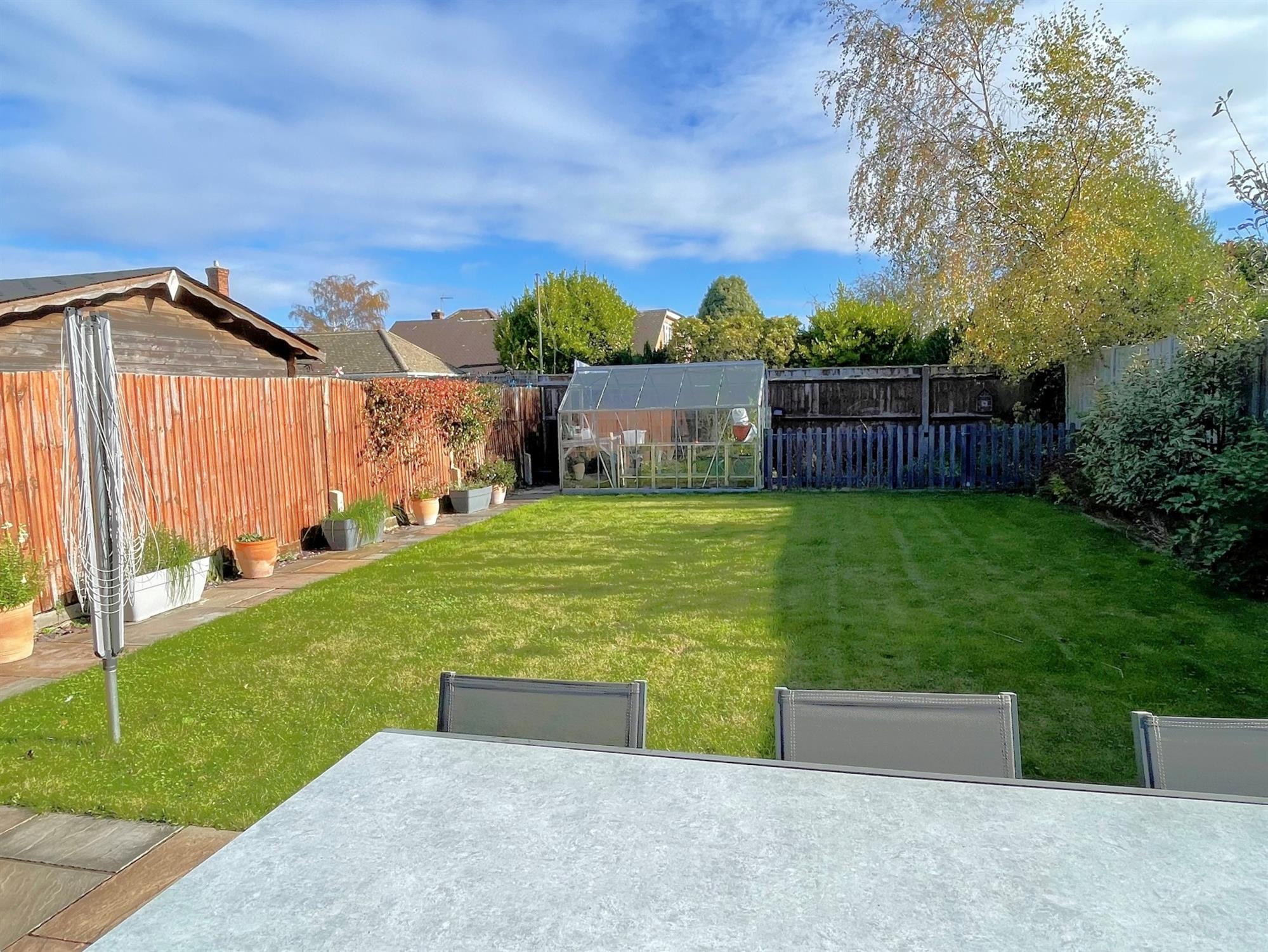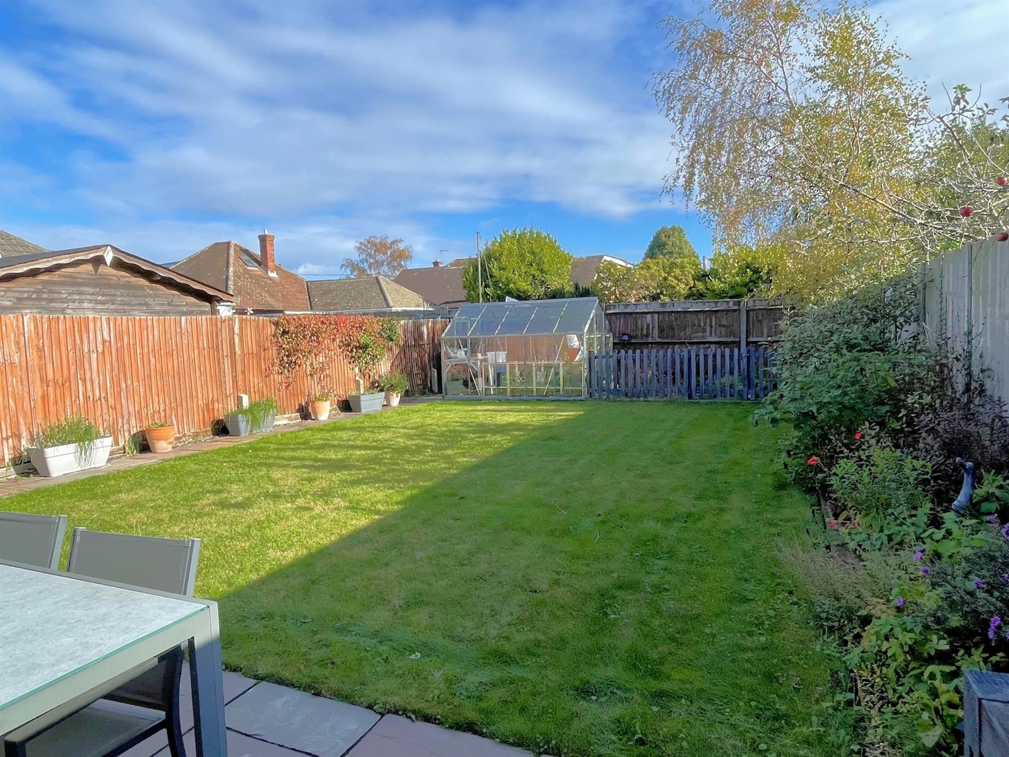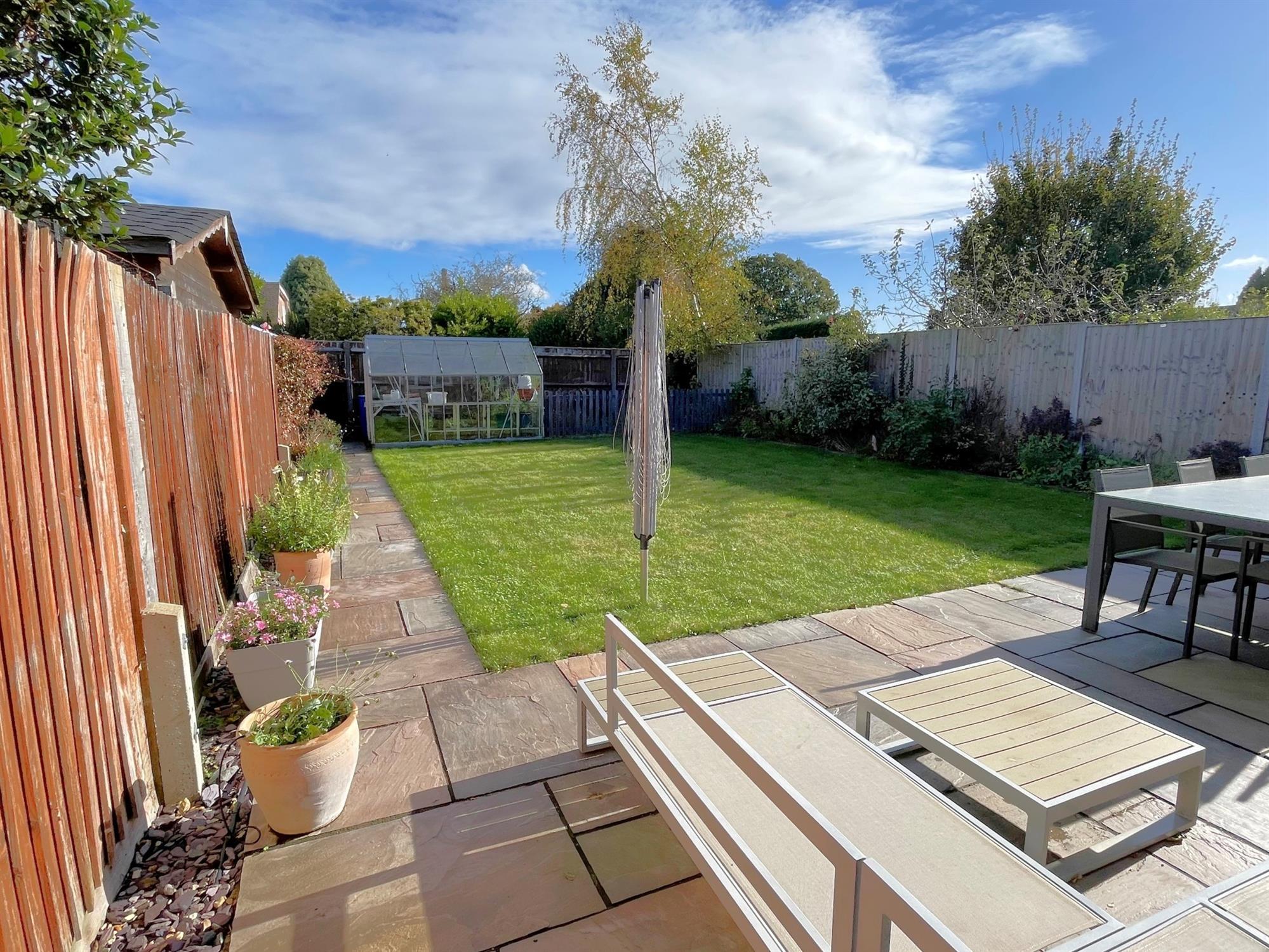 Fenced to boundaries. Paved patio. Laid to lawn. Greenhouse. Pedestrian side gates.