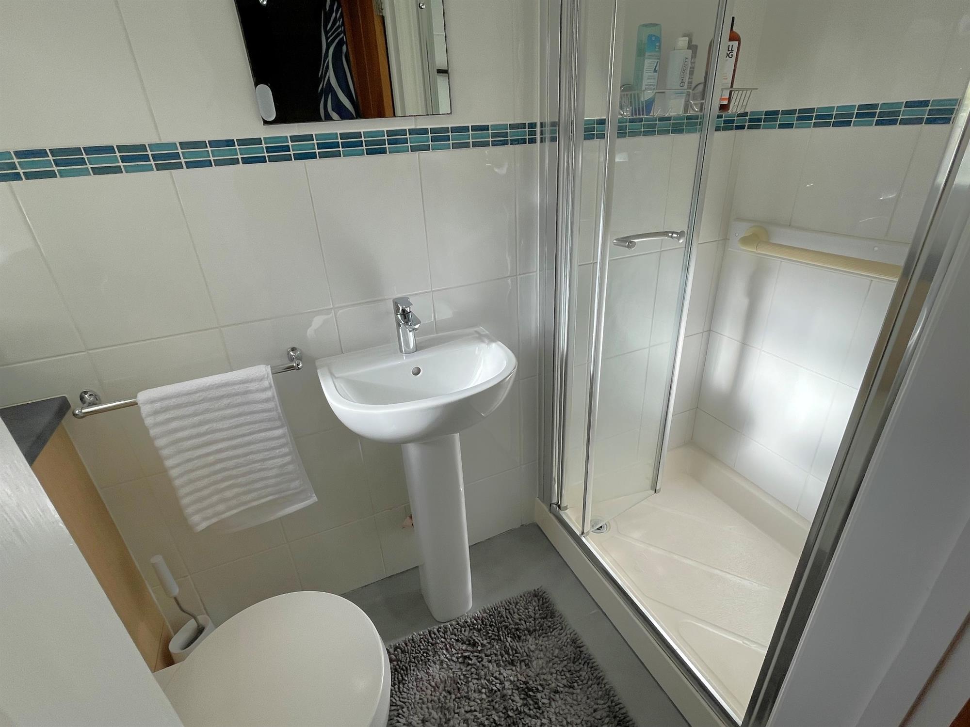 Window to side. Low level WC with concealed flush. Pedestal wash hand basin. Shower cubicle with glazed screen. Fully tiled.