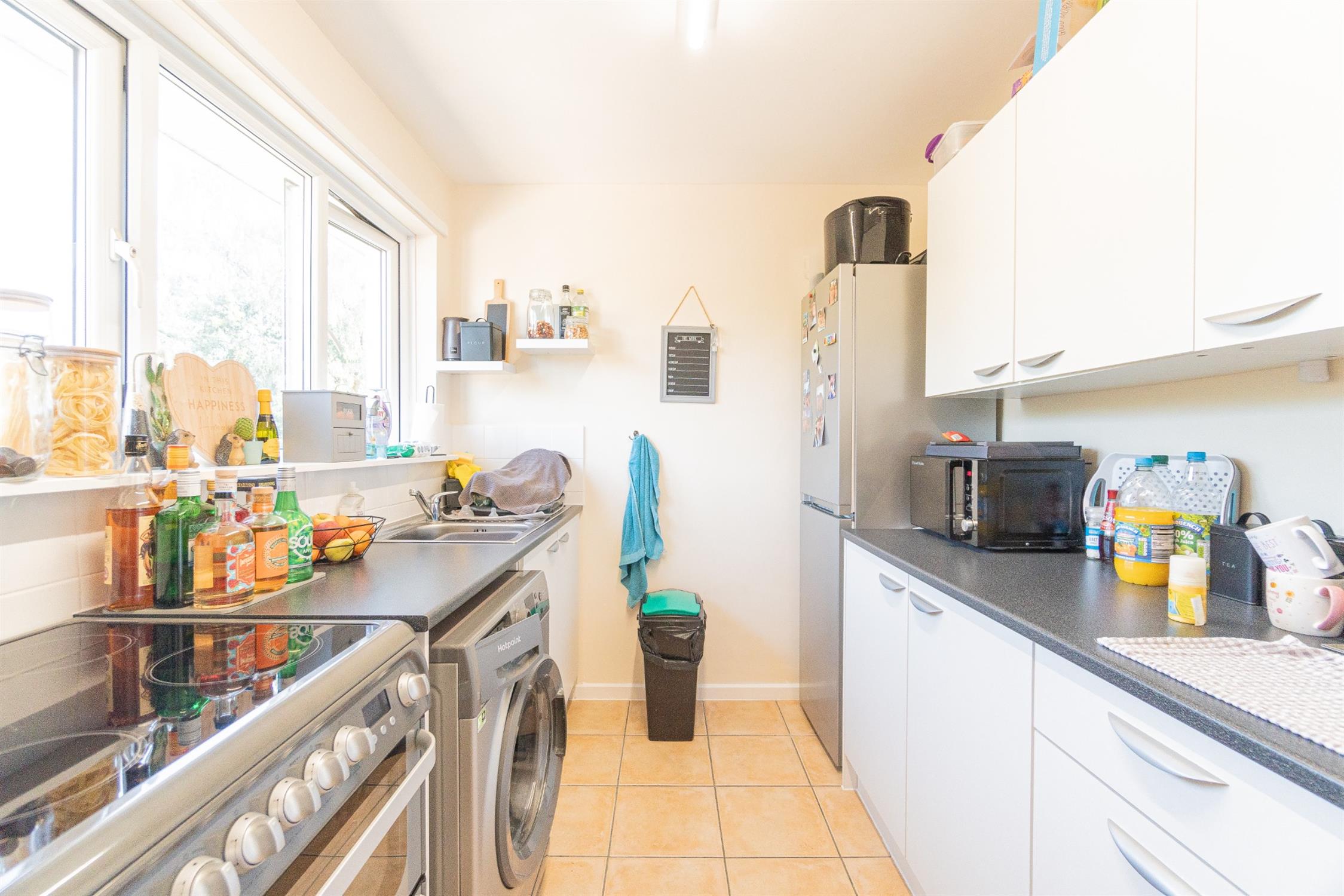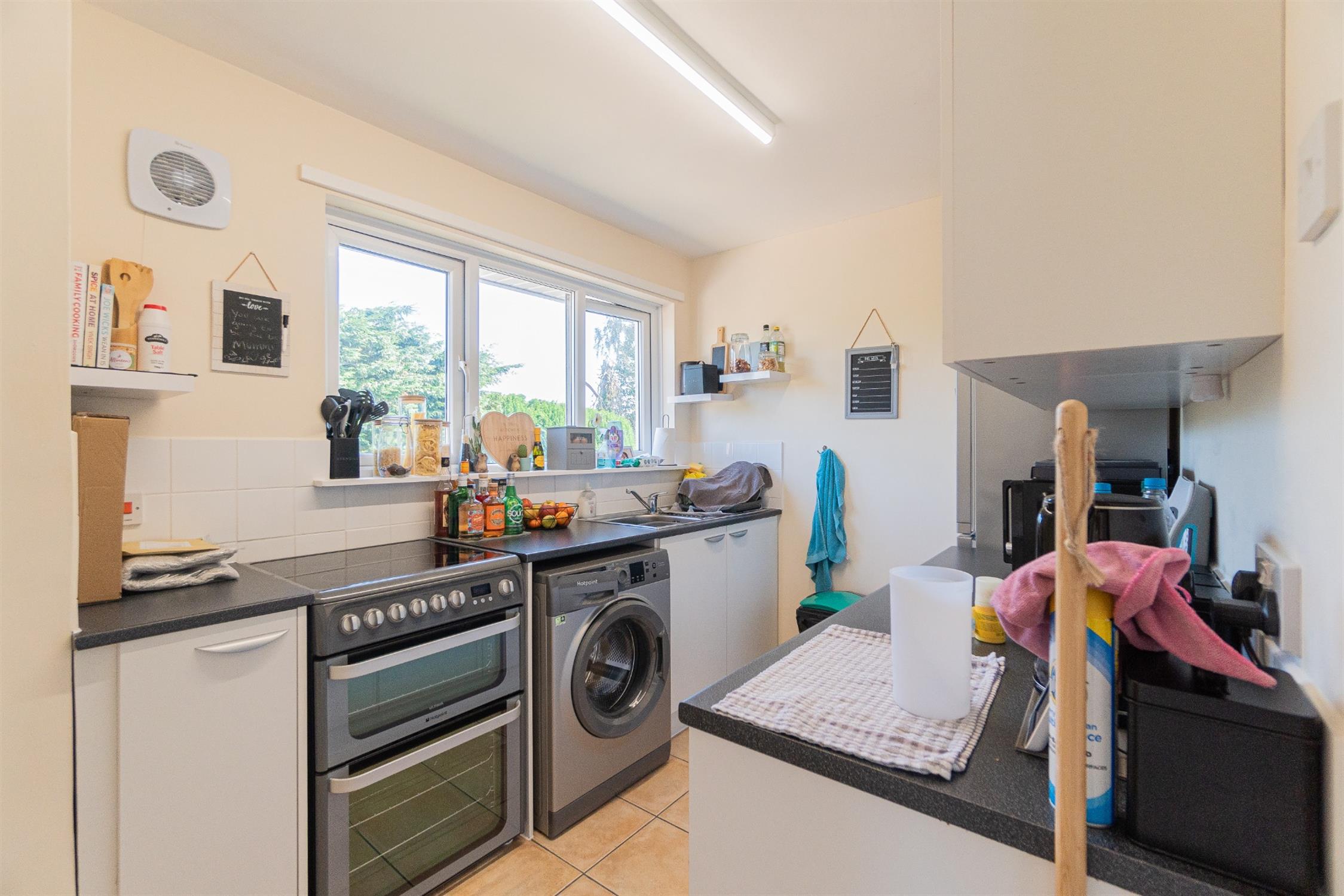 Window to rear. Range of wall and base units with working surfaces over. Single drainer sink unit with mixer tap. Tiled splashback. Electric oven and hob. Washing machine. Fridge freezer. Built in storage cupboard. Tiled floor.