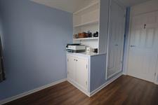 WET ROOM – Modern suite with walk-in shower, toilet, hand basin with storage underneath, heated towel rail, airing cupboard and cupboard housing boiler. Non-slip flooring.