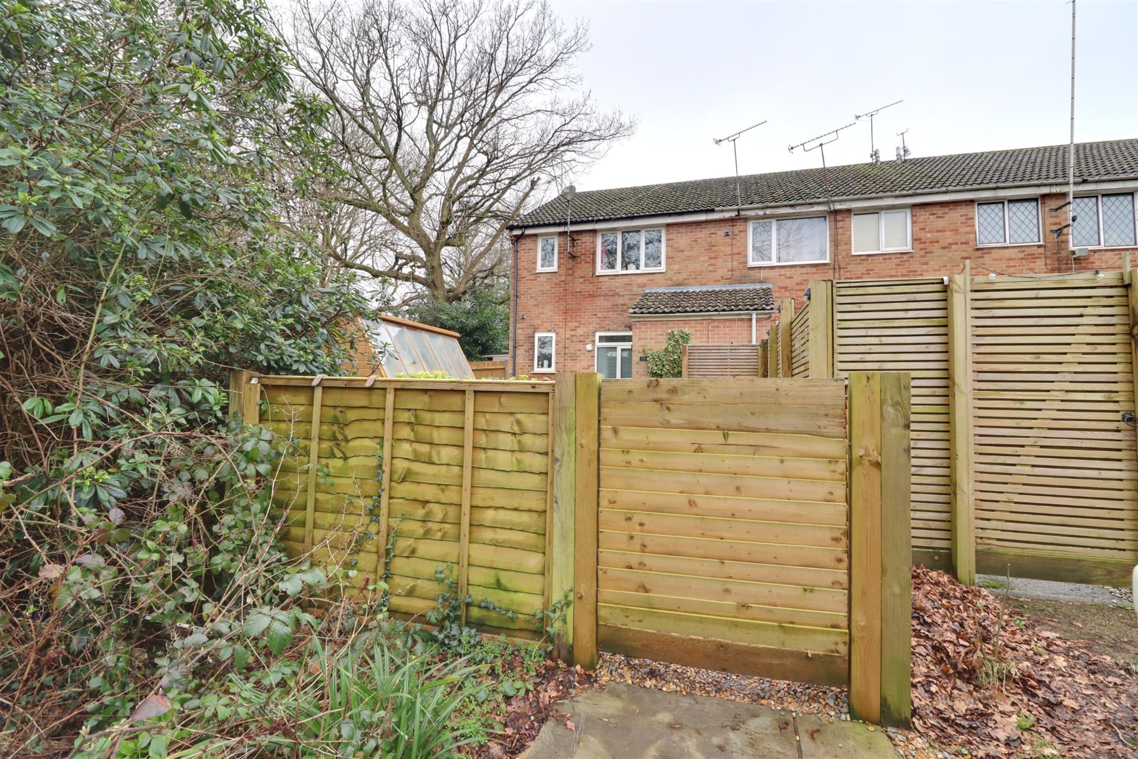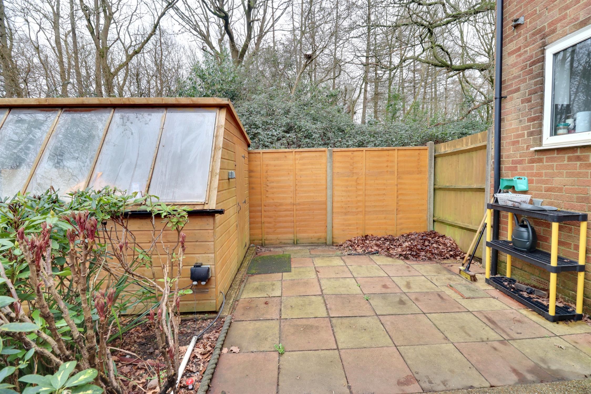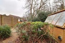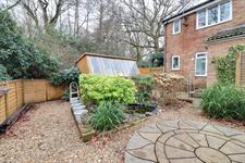 Fully enclosed by fence and gate, attractive circular patio and shingle, mature shrubs and borders, large wooden shed, outside power sockets.