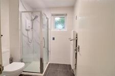 Re-fitted modern suite comprising shower cubicle with glass door, low-level WC, wash basin in pedestal, heated towel rail, side aspect double glazed window, laminate flooring.