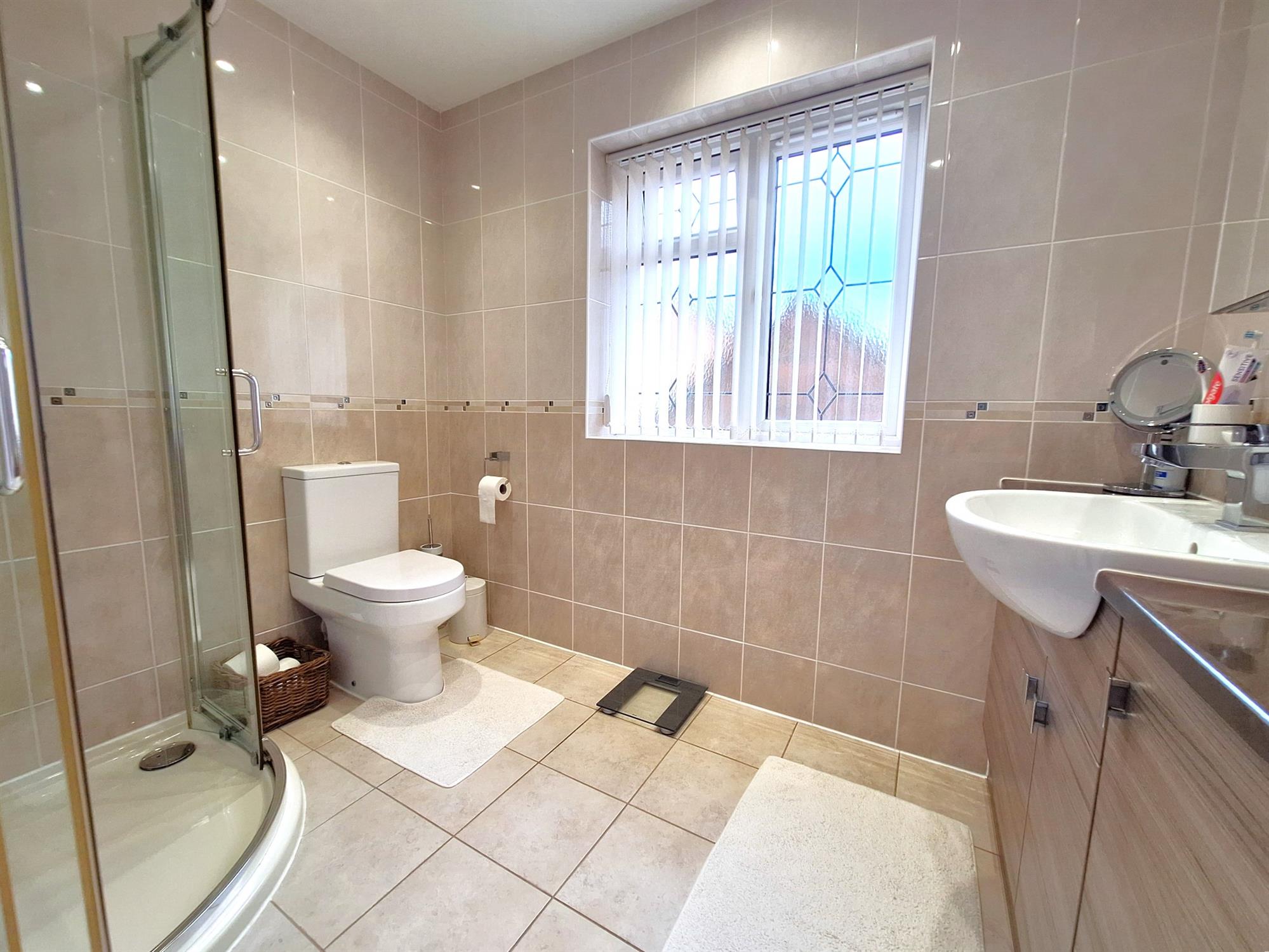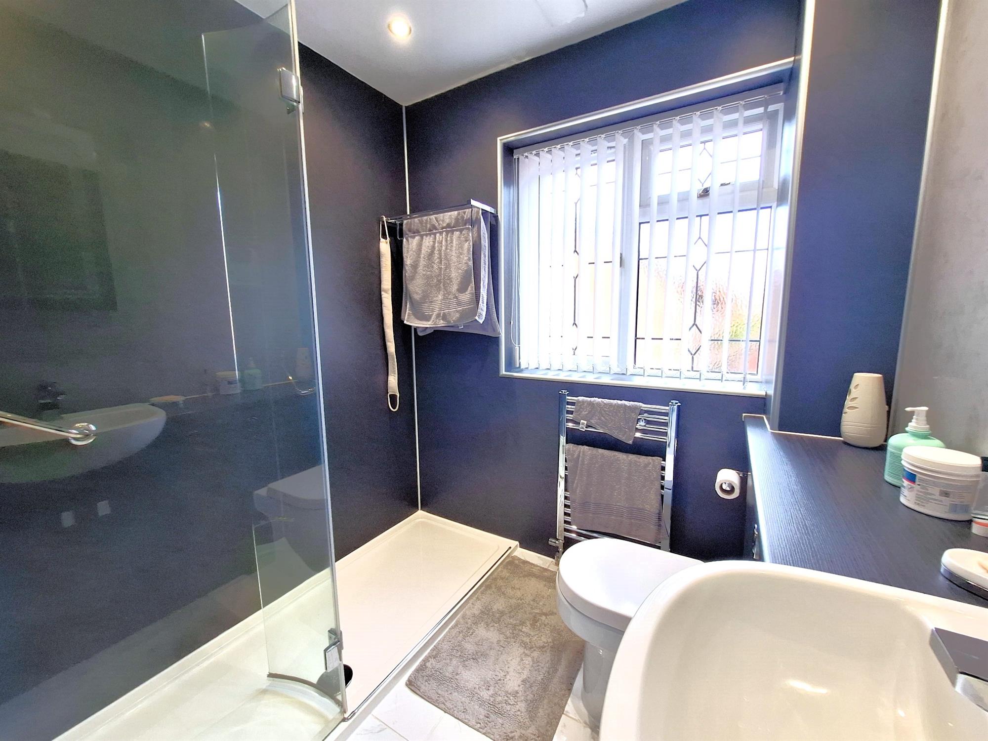 Double-glazed window to front aspect. The refitted suite comprises: glazed shower enclosure, concealed cistern WC, vanity housed wash basin with cupboards under, ceramic tiled flooring, full-height waterproof splash panel wall elevations, heated towel rail – radiator, ceiling down lights.