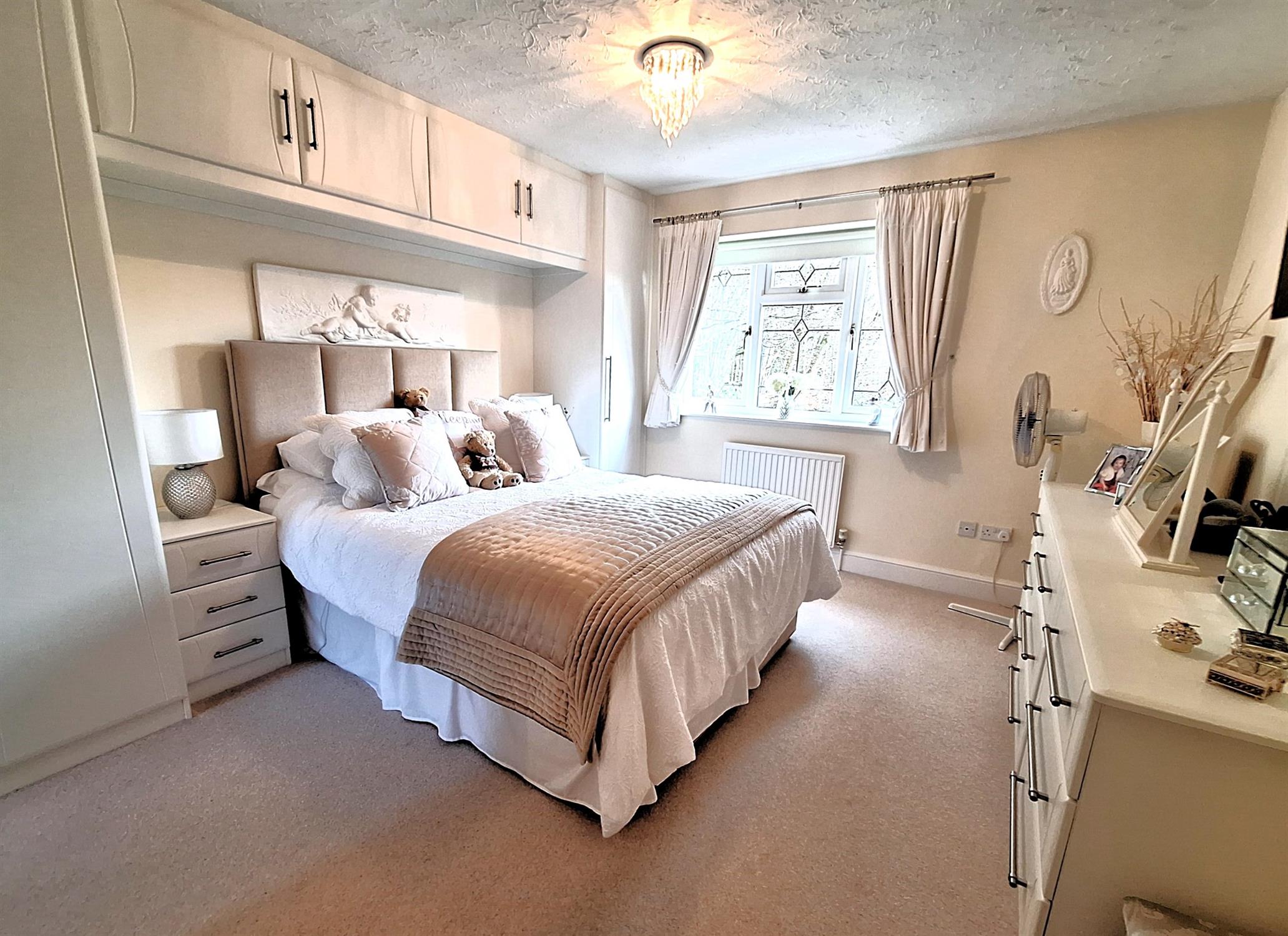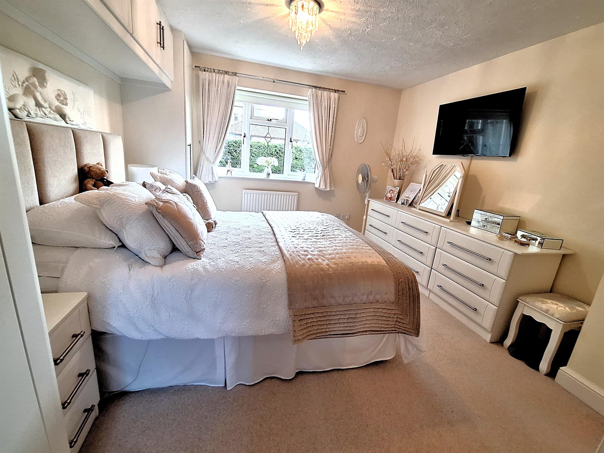 Double-glazed window to the rear aspect. Radiator. TV aerial point. Full range of fitted furniture with wardrobes and cupboards extending to the dressing area, carpeted flooring, door to:
