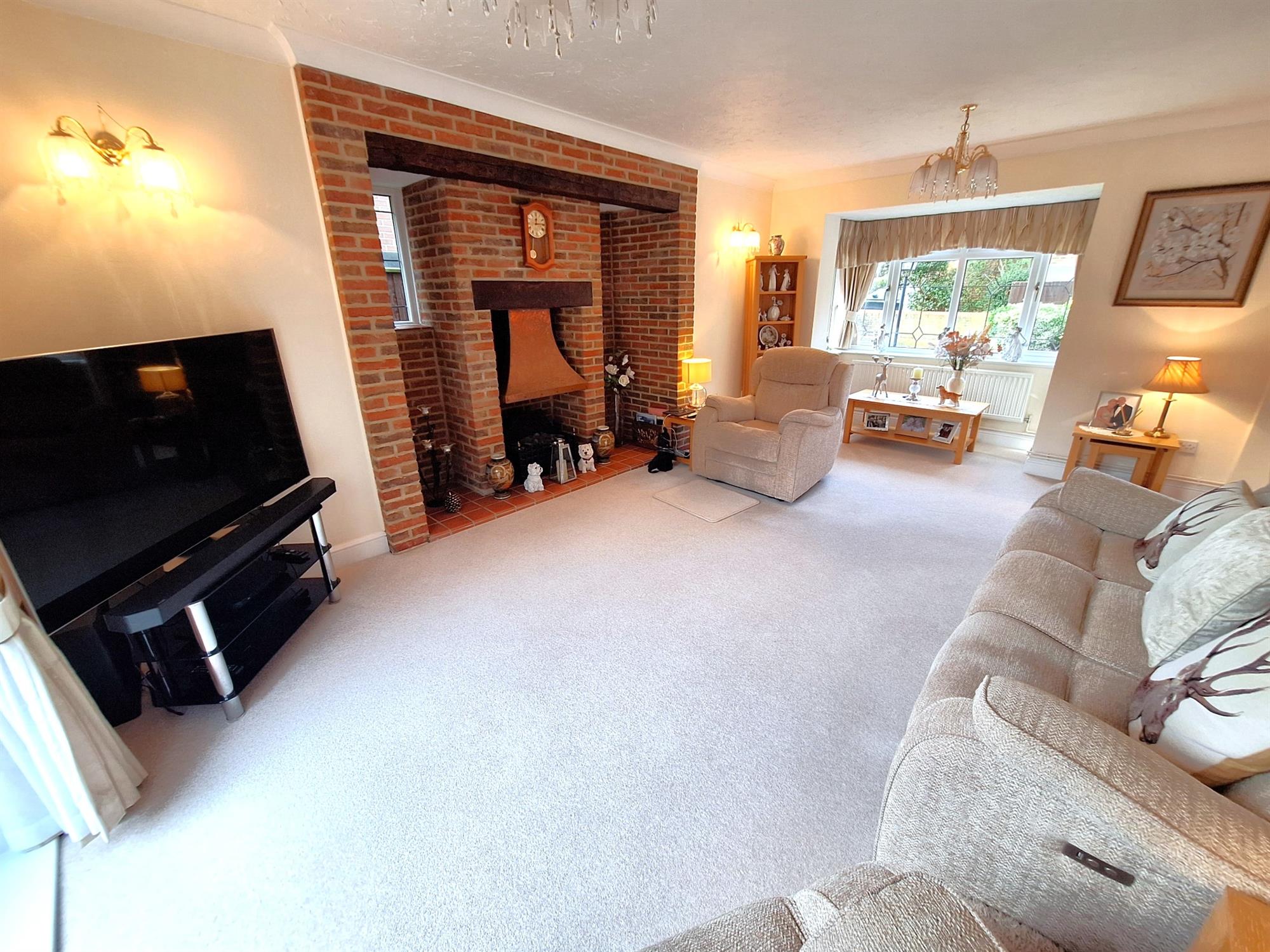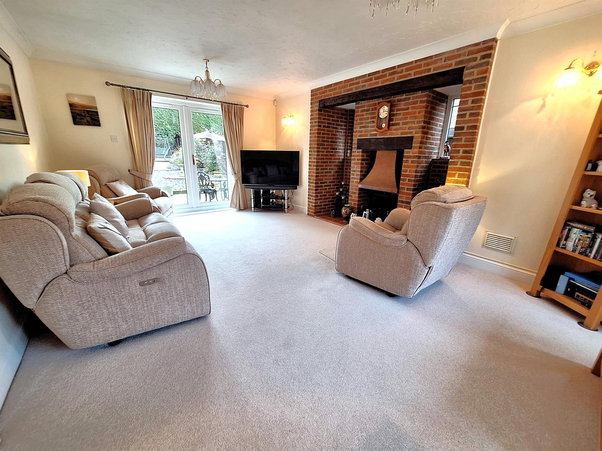 Double-glazed bay window to the front aspect, glazed doors opening and accessing the rear gardens. Two windows to the side aspect. Feature, brick-built inglenook fireplace. Two radiators. TV aerial point. Carpeted flooring.