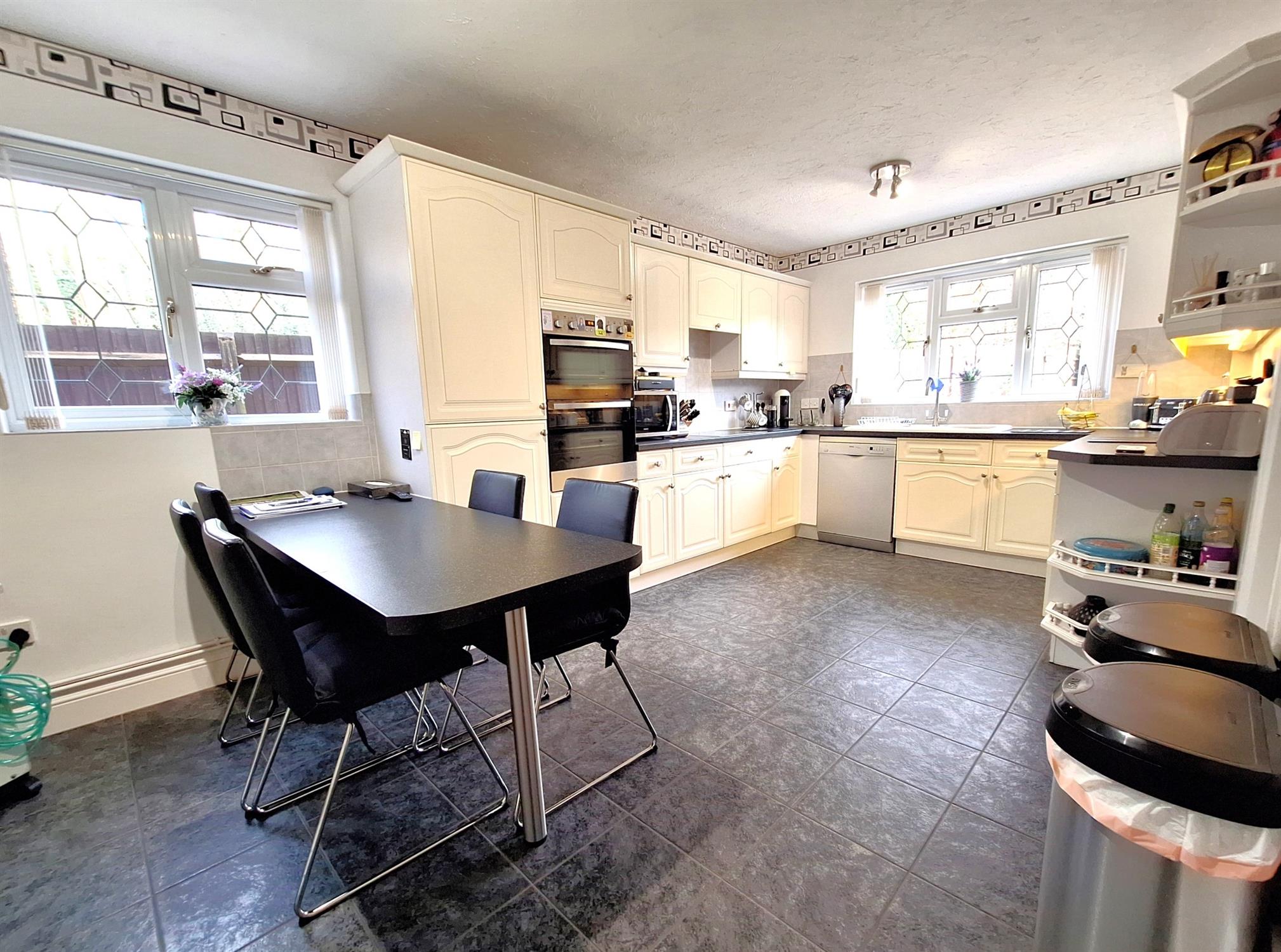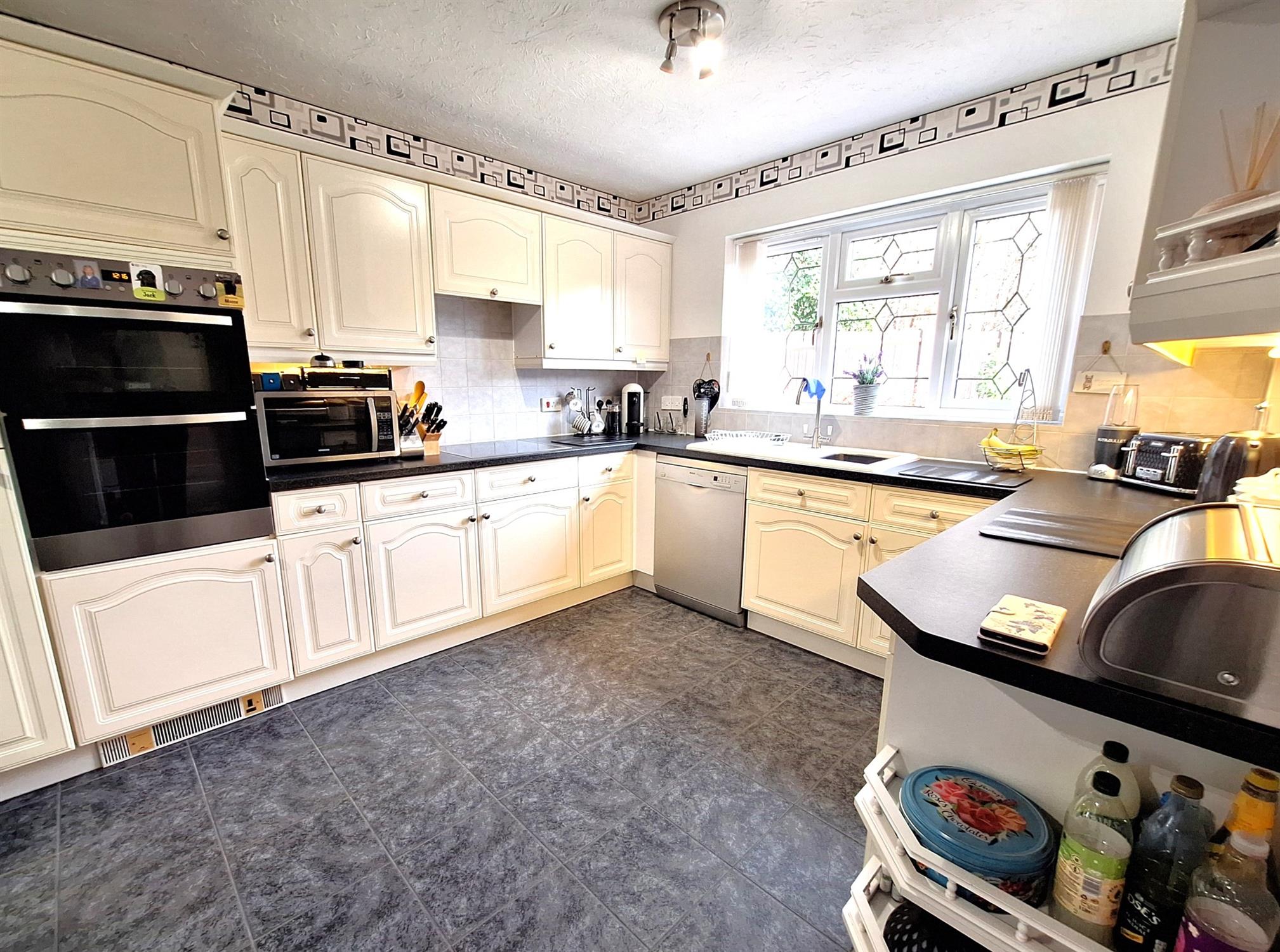 Double-glazed window to rear and side aspects. Fitted with a good range of white wall and base units with roll edge work surfaces over and inset one-and-a-half bowl single drainer sink. Integrated fridge / freezer. Double electric oven with induction hob and extractor hood over. Breakfast bar, doors to the utility room.