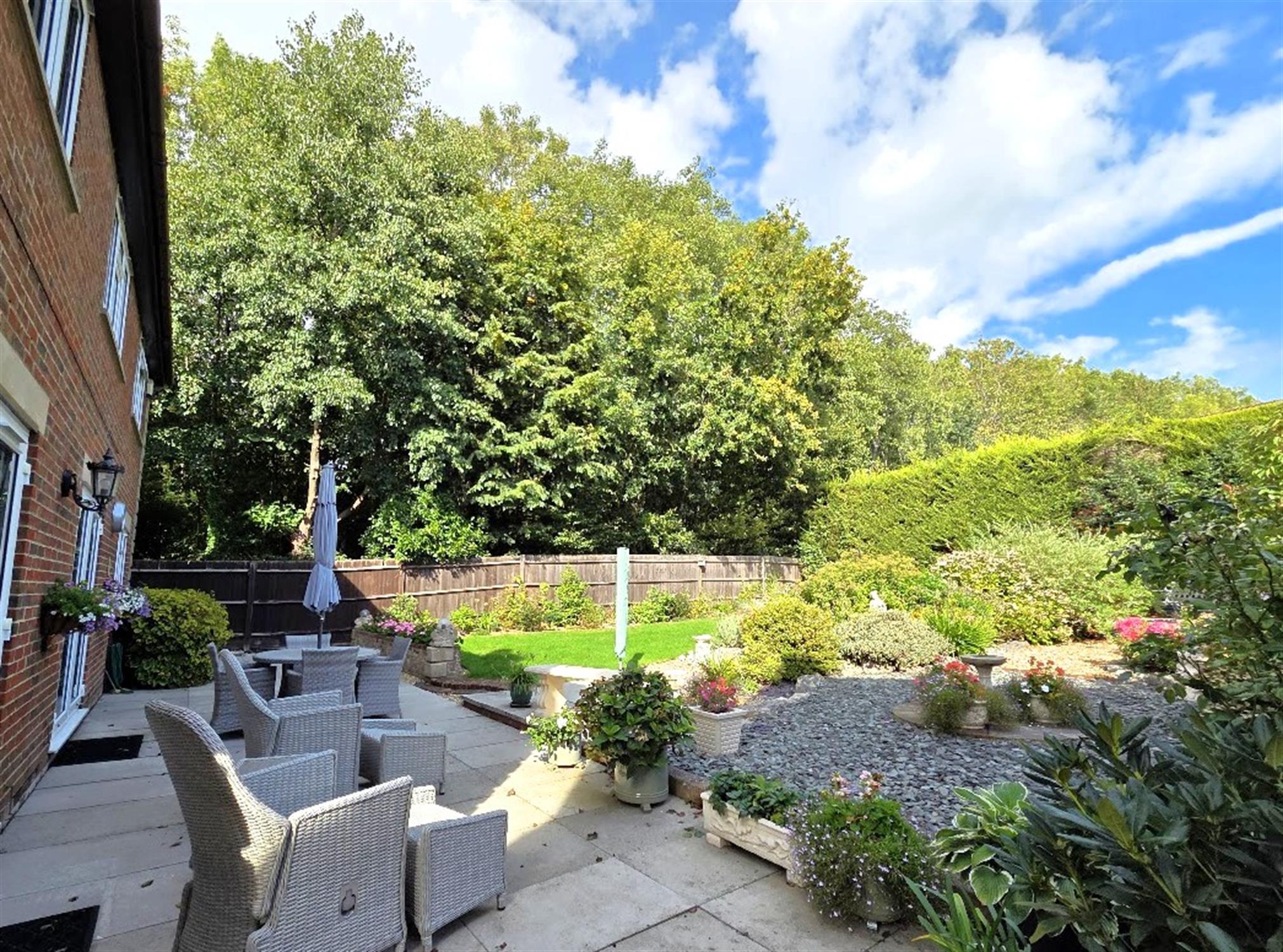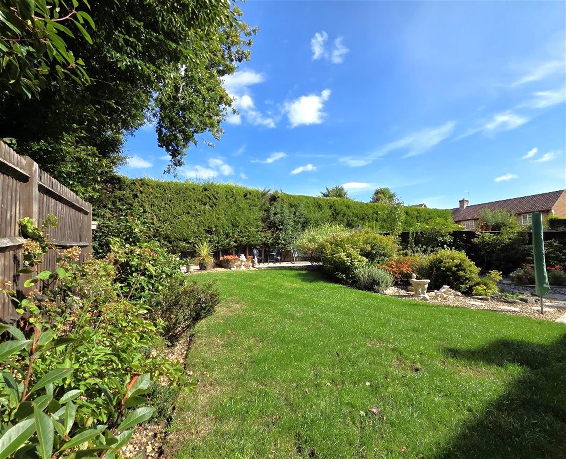 The rear garden is laid to lawn, with enclosed panel fencing, and several paved patio areas. Flower and shrub borders, tree-lined side aspect. Timber shed. Double electric power points. Two exterior water taps.