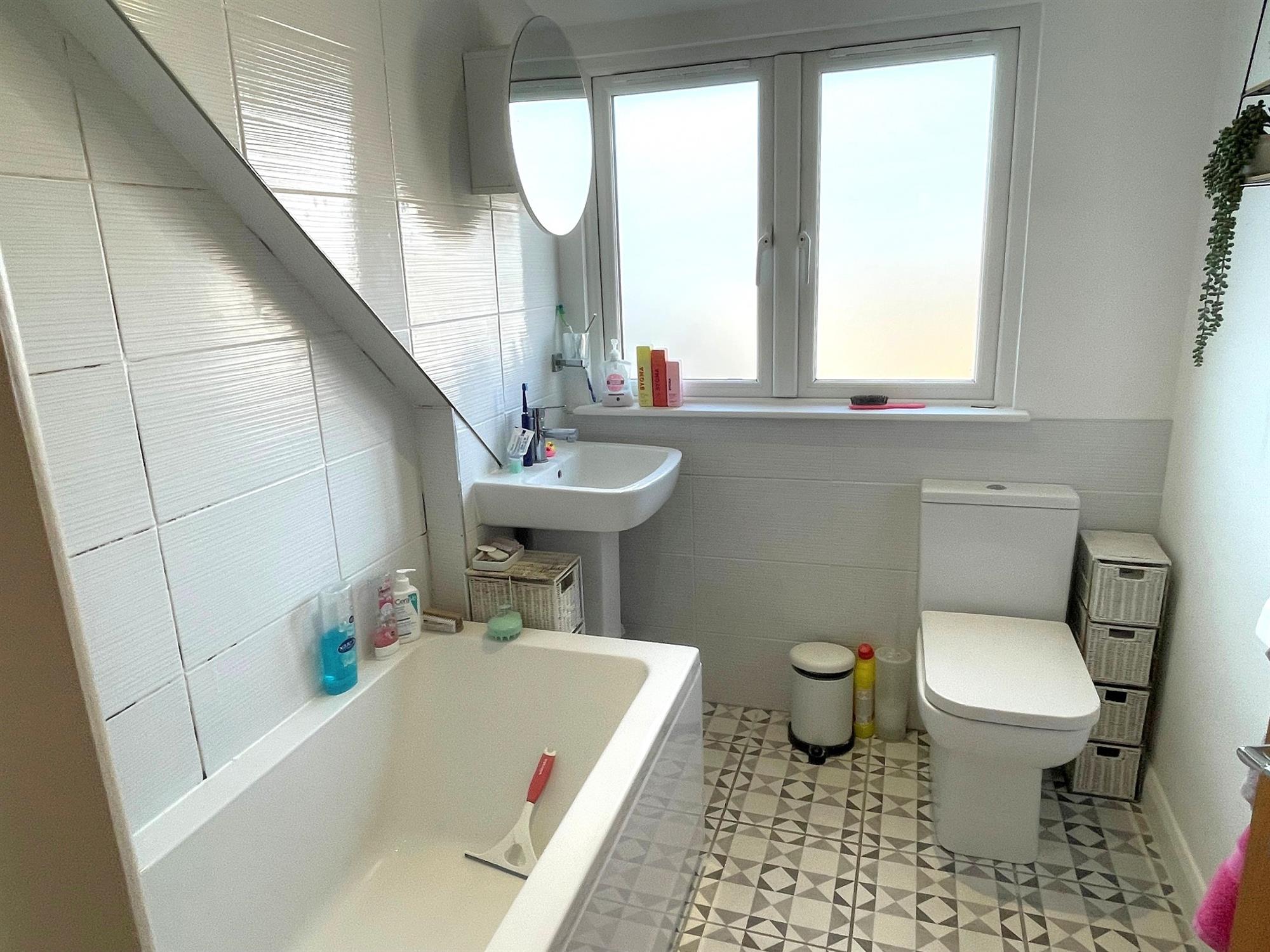 Window to front. Low level WC. Pedestal wash hand basin. Panelled bath with shower over. Complementary tiling. Heated towel radiator.