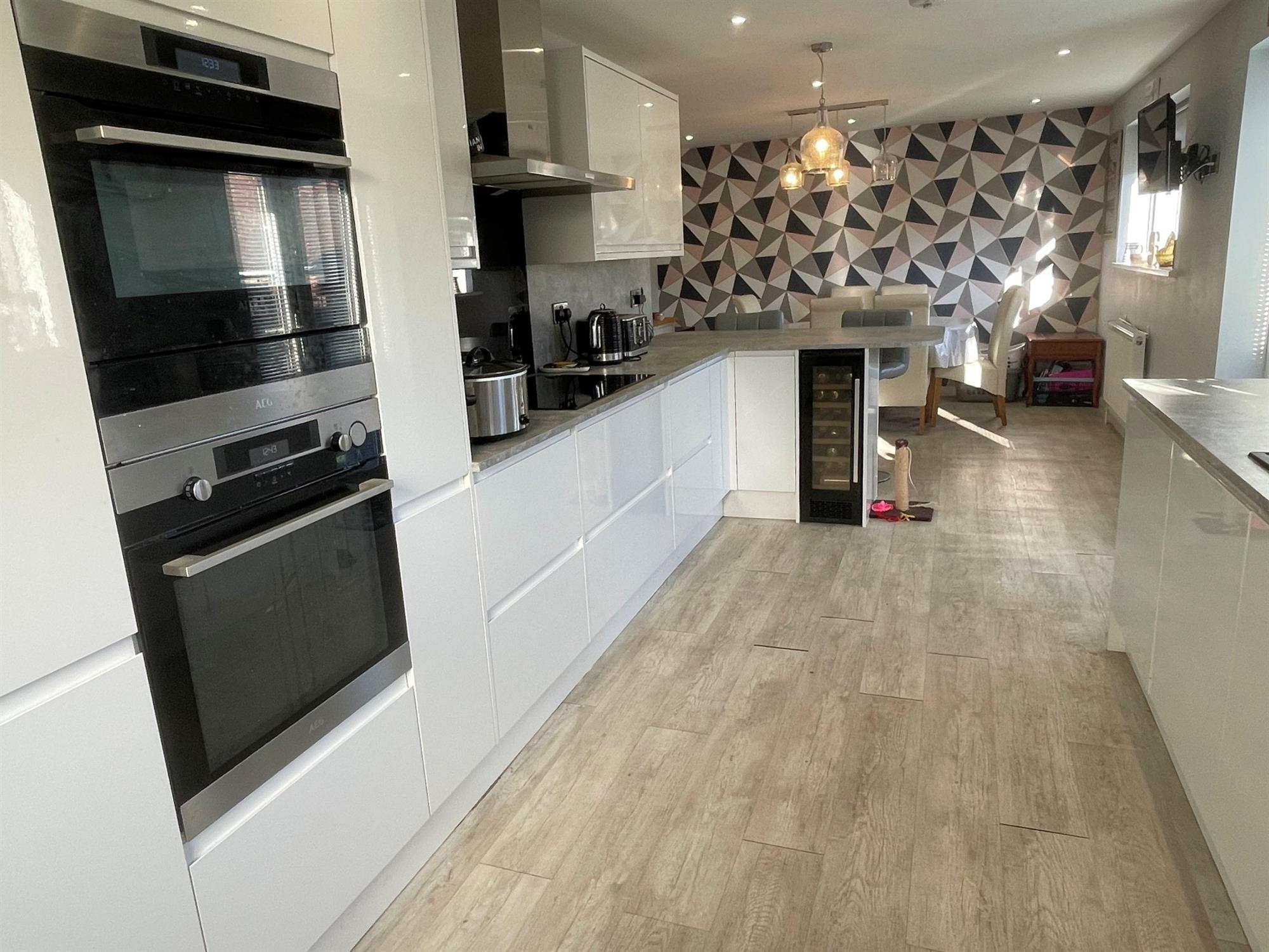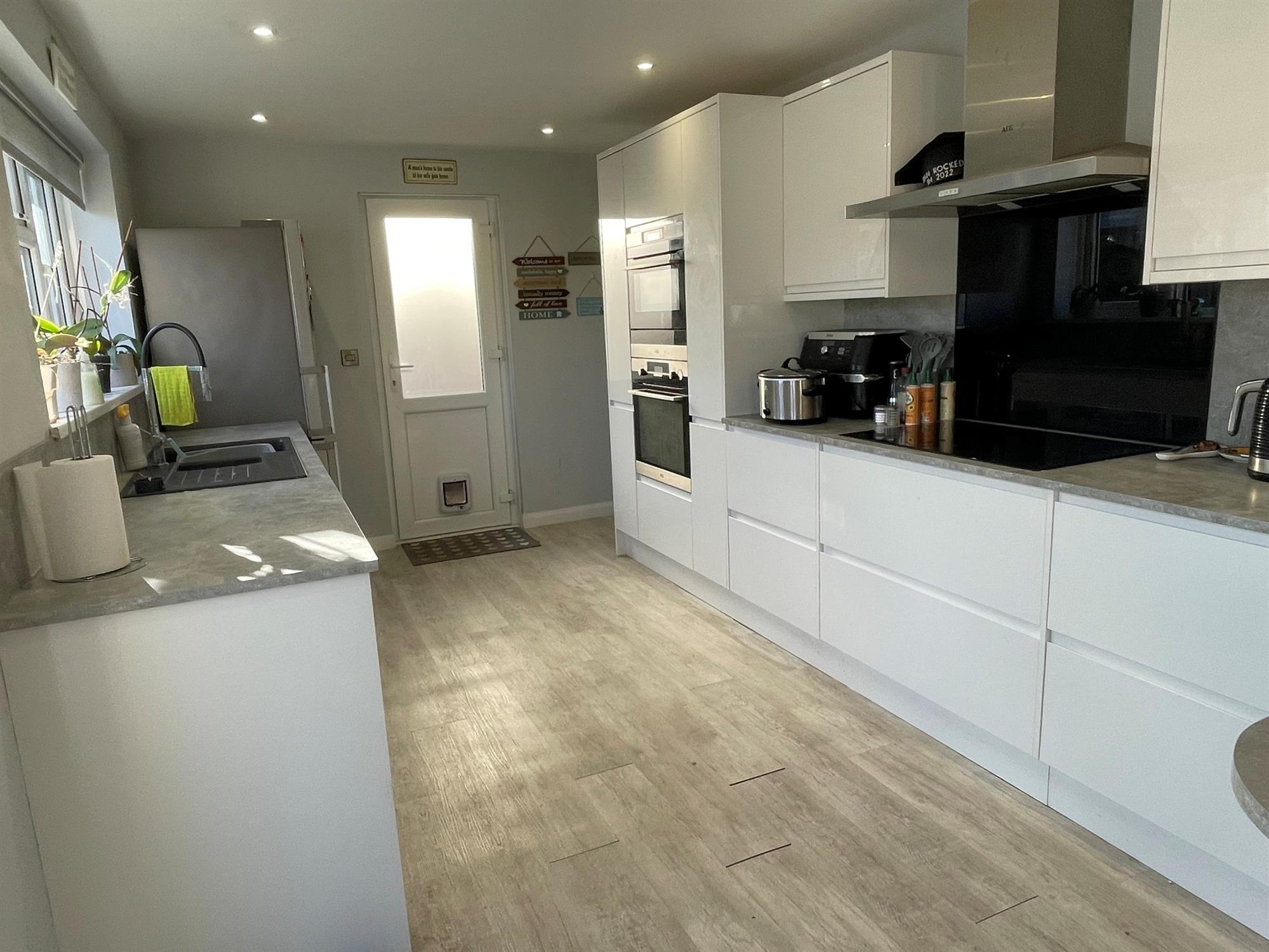 Two windows to rear. Range of wall and base units with work surfaces over. One and a half bowl inset sink unit with drainer. 5 ring induction hob with extractor over. Built in double electric oven. Space for fridge freezer. Television point. Radiator. Double opening doors to garden. Door to side. Door into: