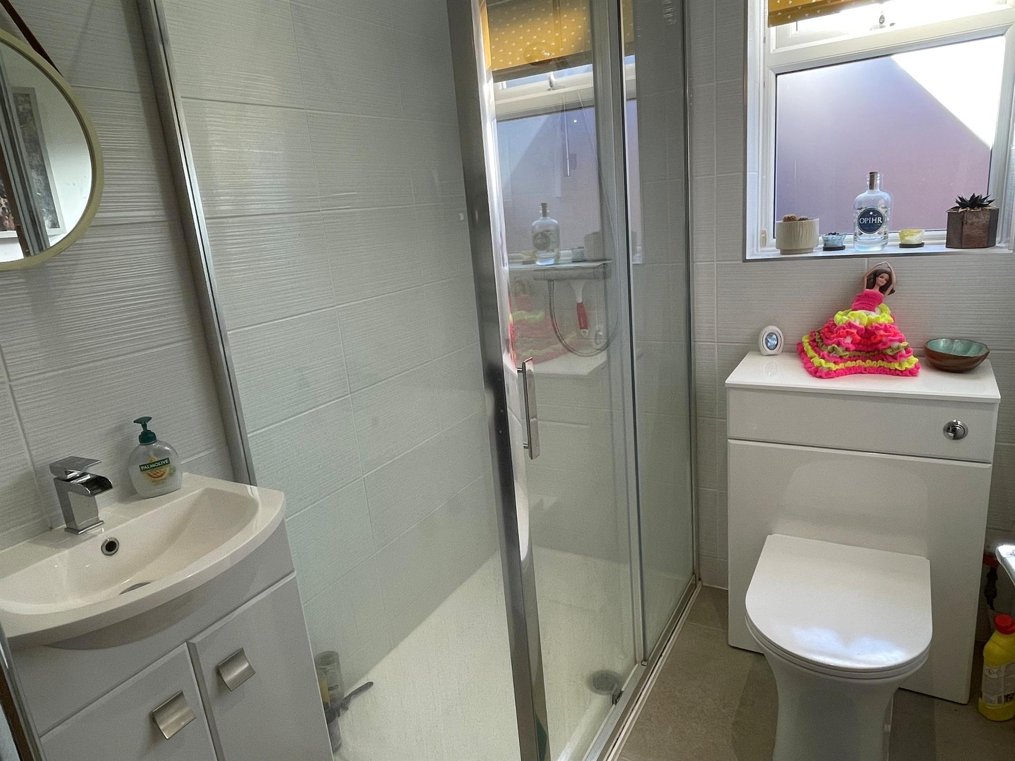 Window to side. Low level WC. Inset wash hand basin with cupboard below. Shower unit with glazed sliding door. Complementary tiling. Heated towel radiator.