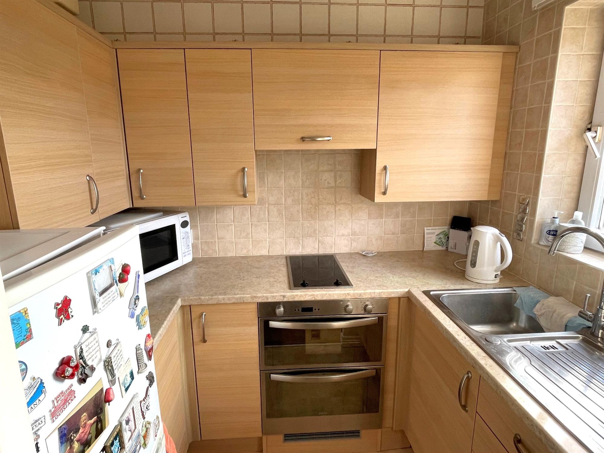 Range of wall and base units with work surface over. Single drainer stainless steel sink unit. Tiled splashbacks. 2 ring electric hob with extractor over. Built-in double electric oven. Space for fridge freezer.