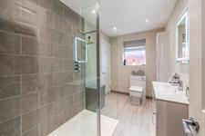 Smooth plastered ceiling, spotlighting, double glazed obscure window to the side aspect, a three piece shower suite comprising; low level WC, ceramic sink with mix tap in chrome finish, spacious shower with mains shower head over. Heated towel rail.