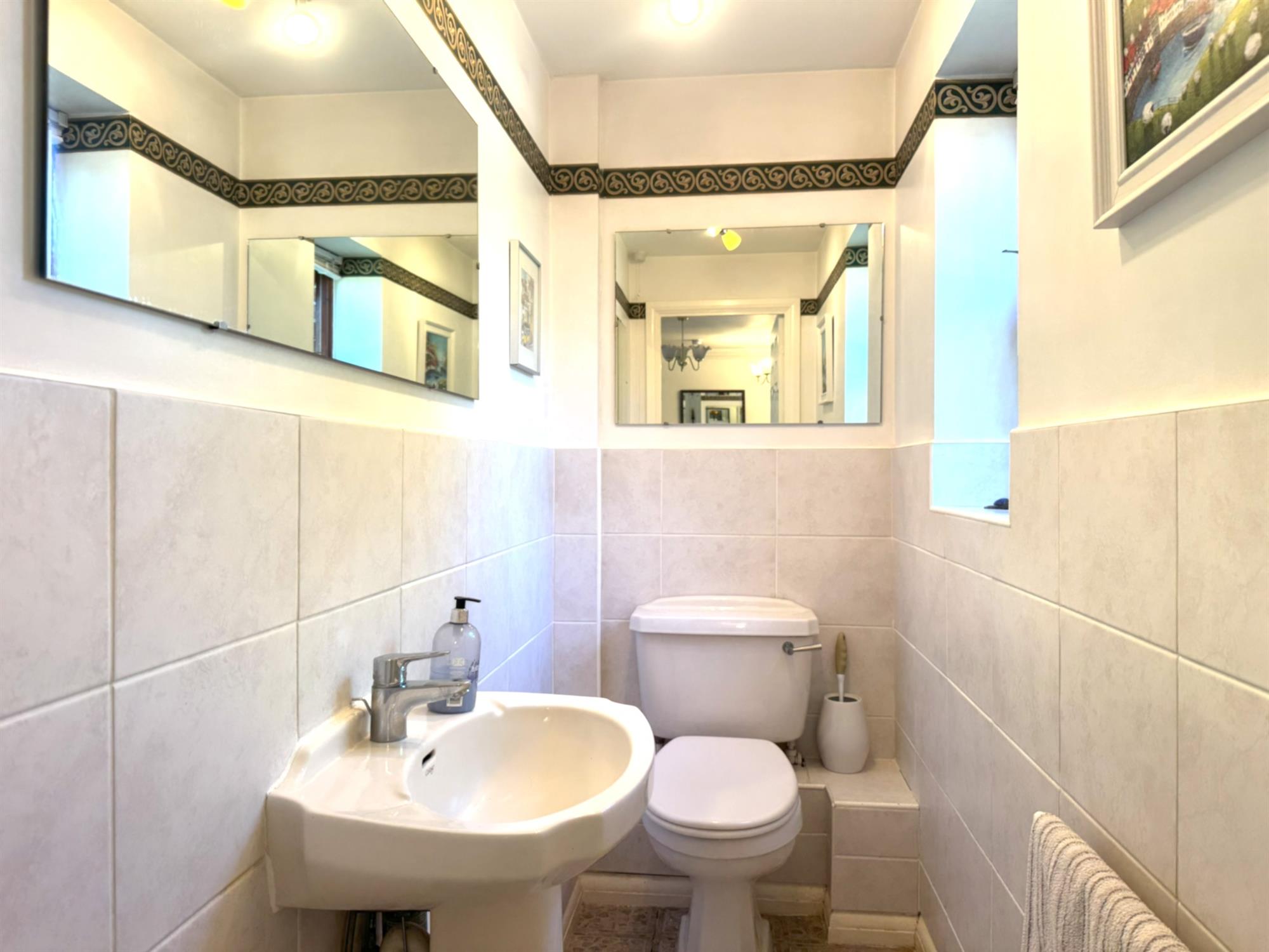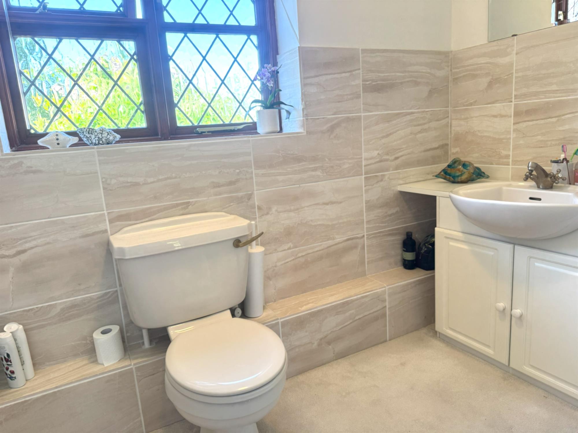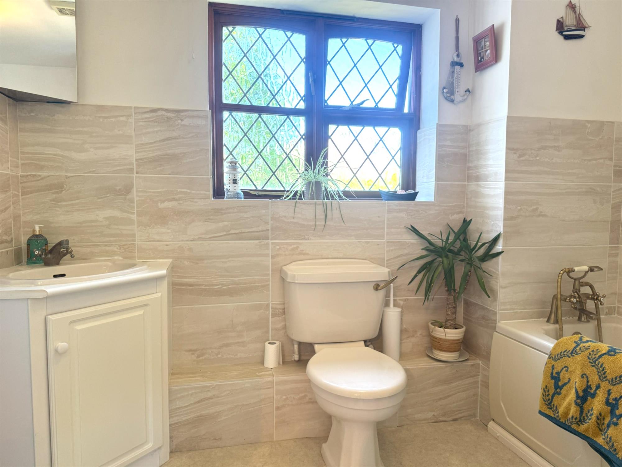 Low-level WC, pedestal wash basin, ceramic tiled wall elevations, tiled flooring, radiator, timber-framed double-glazed window to the side aspect.