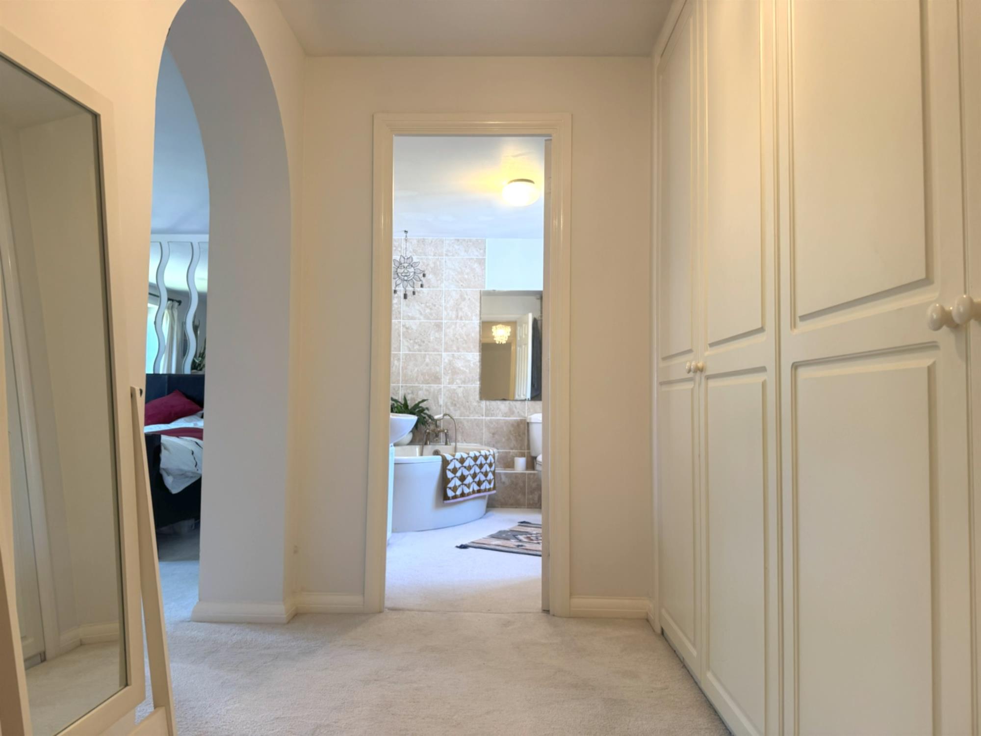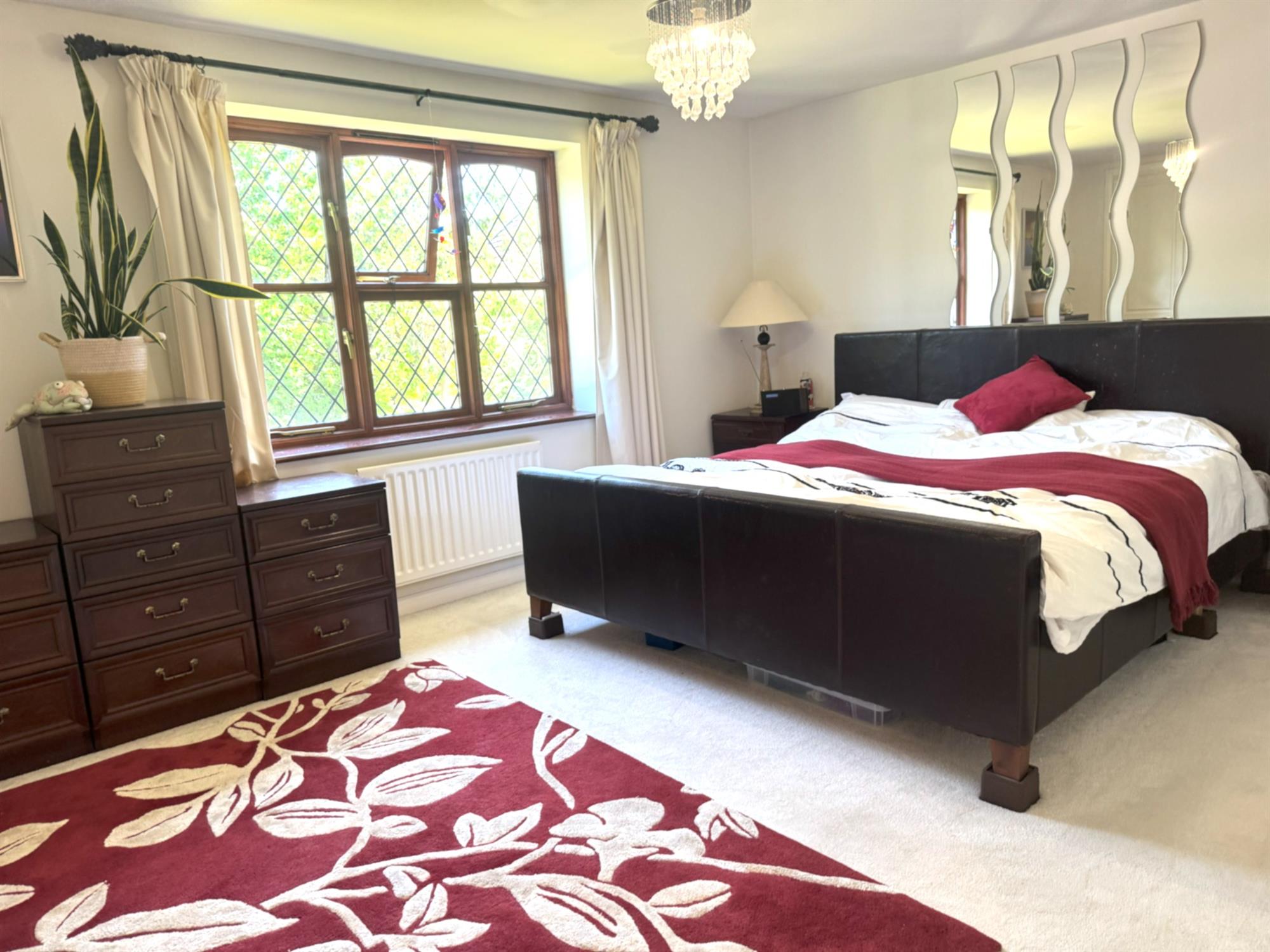 Double-glazed timber-framed window to the rear aspect, extensive range of fitted wardrobes with shelf and hanging space, radiator, carpeted flooring, open aspect to the: