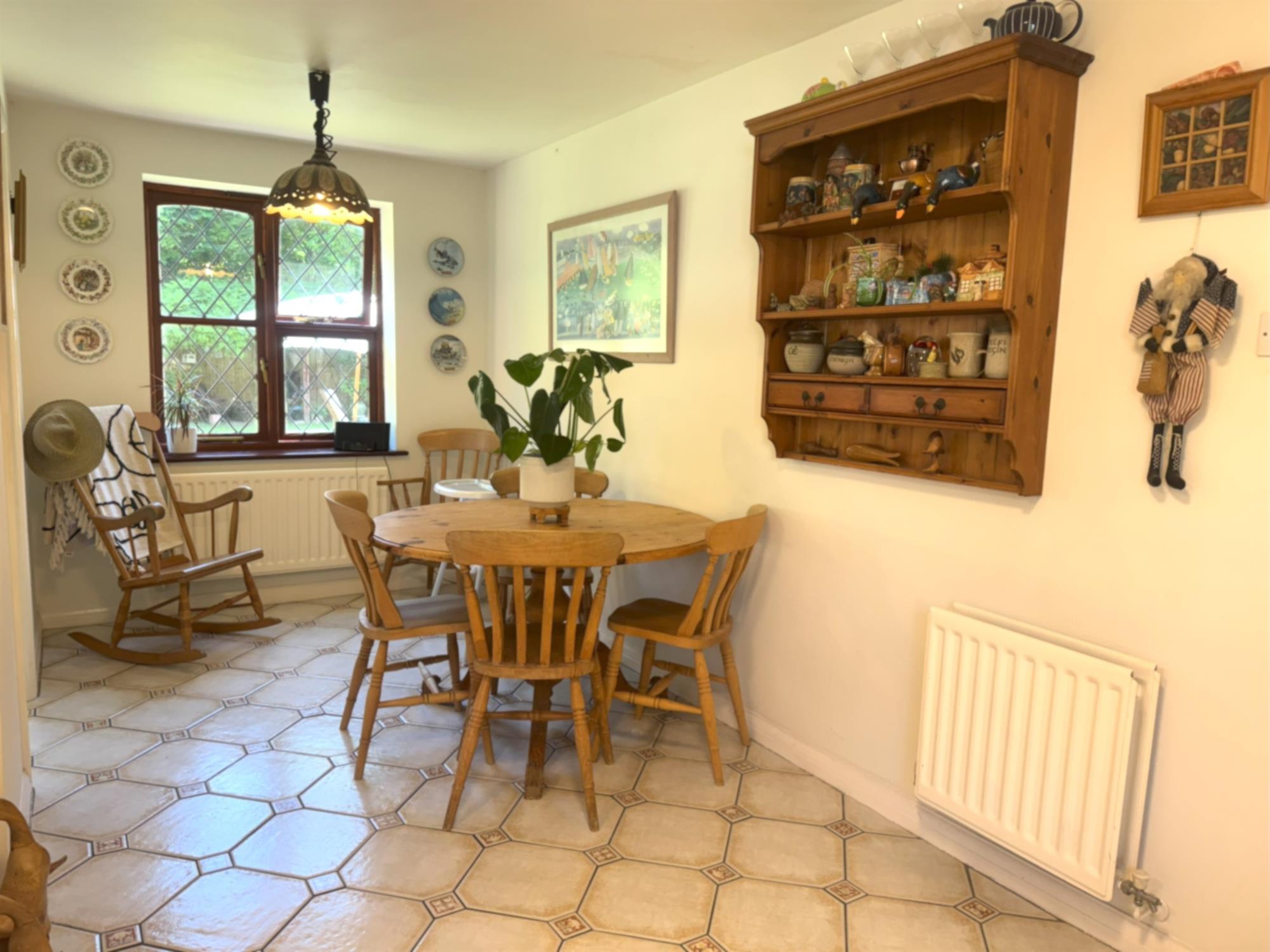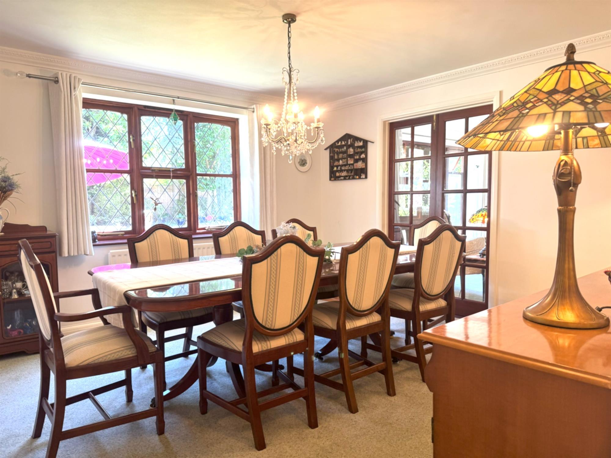 A double-aspect room with timber-framed double-glazed windows to the front aspect, timber-framed double-glazed doors opening and-overlooking the rear garden, feature stone fireplace with a living flame coal effect gas fire, radiators, TV aerial point, telephone point, glazed double doors opening to the separate dining room.