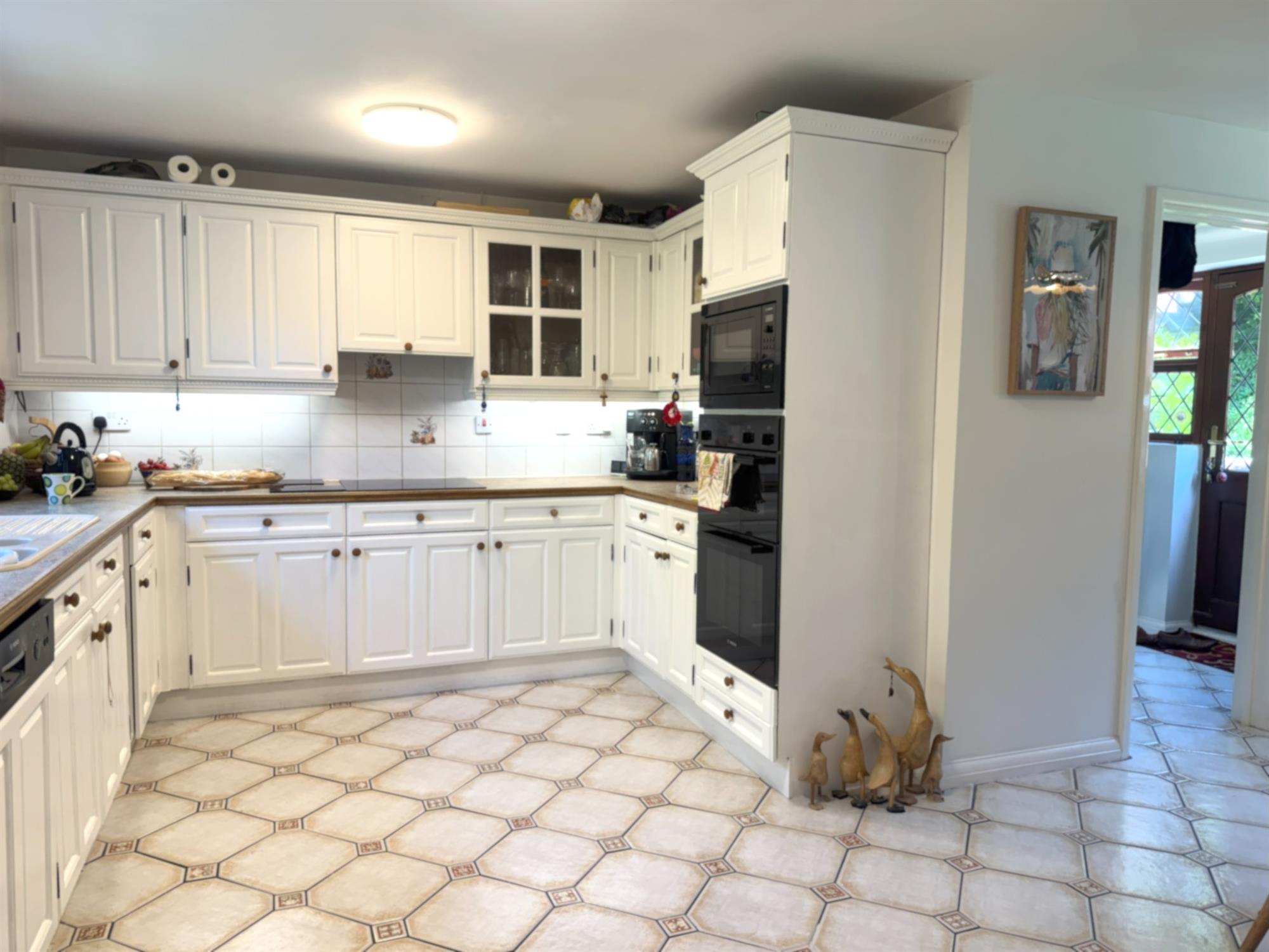 A fitted range of light-coloured cabinetry, incorporating a range of eye and base level cupboards and drawers, work surfaces incorporating ceramic tiled splash backs, fitted double ovens, fitted integrated microwave oven, ceramic induction hob with glazed matching extractor hood, fitted fridge - freezer, inset white acrylic sink, with a mixer tap over, integrated dishwasher, timber framed double-glazed window to the front and rear aspects, ceramic tiled flooring, radiators, door to: