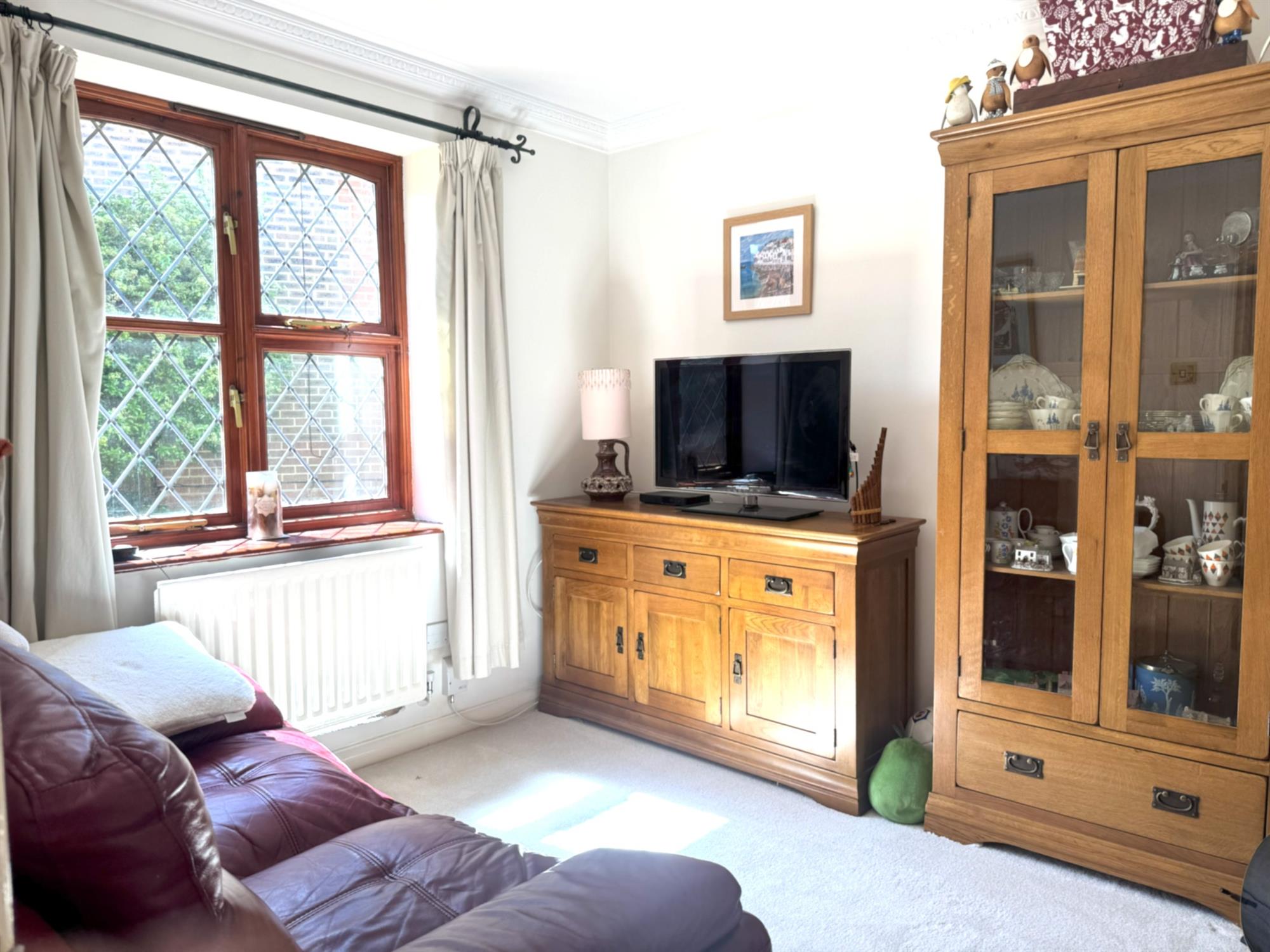A generous room with timber-framed double-glazed window overlooking the rear garden, radiator, timber-framed glazed french double doors opening into the sitting room, carpeted flooring.