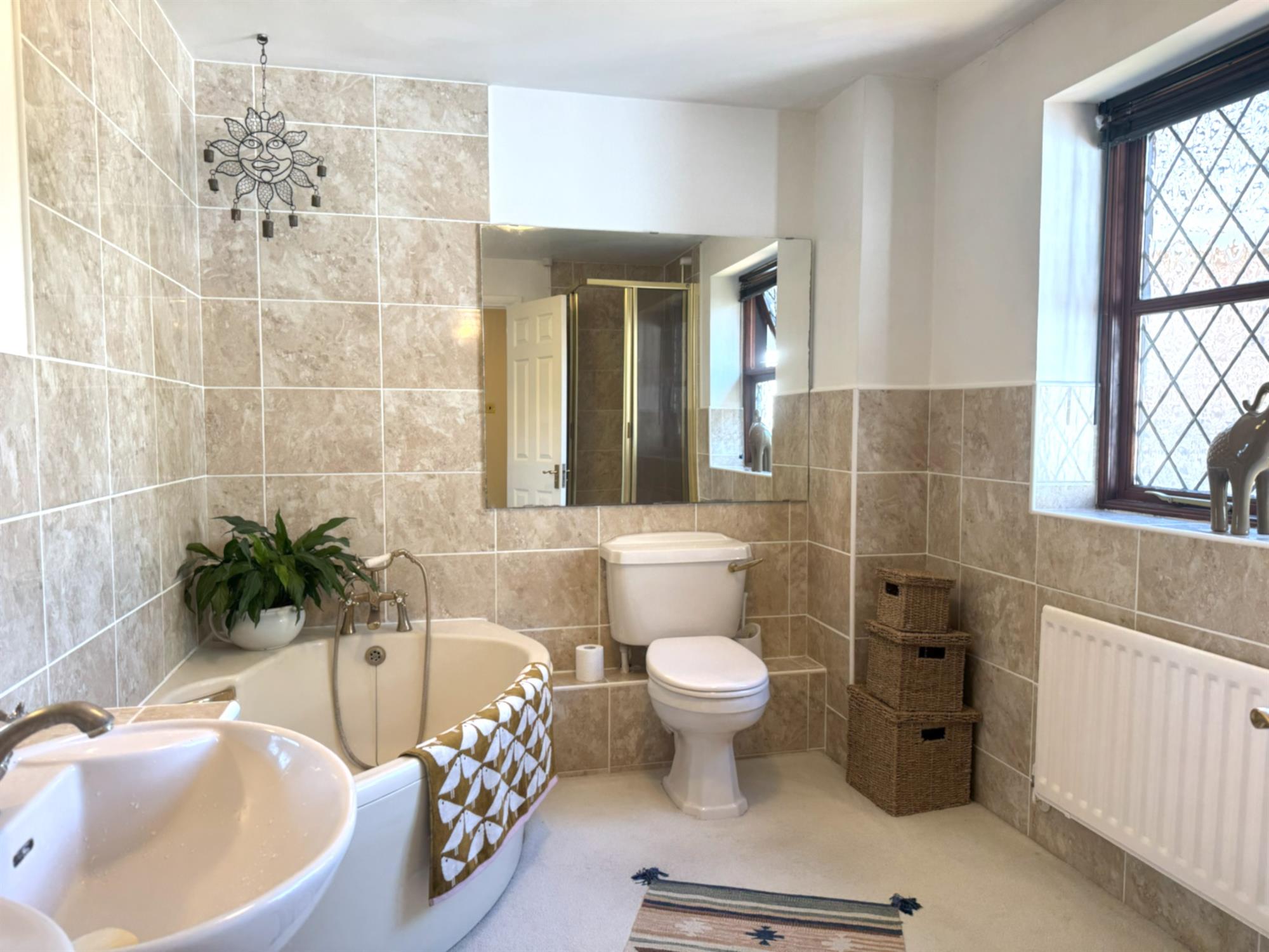Large corner bath with shower attachment off tap, vanity housed wash basin with drawers - cupboards under, low level WC, glazed shower enclosure with mains-fed shower, light and shaver point, timber-framed double-glazed window to the front aspect, tiled wall elevations, carpeted flooring, heated towel rail-radiator.