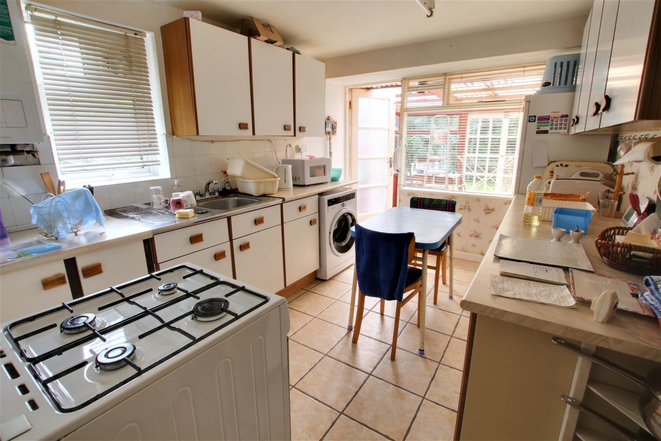 KITCHEN Dual aspects include double glazed window to side elevation and window and door to conservatory, fitted with wall and base units with roll edge work surfaces and tiled surrounds, sink and drainer with mixer taps, space and plumbing for washing machine, space for fridge/freezer, wall mounted Vaillant boiler, space for table and chairs, power points.