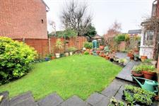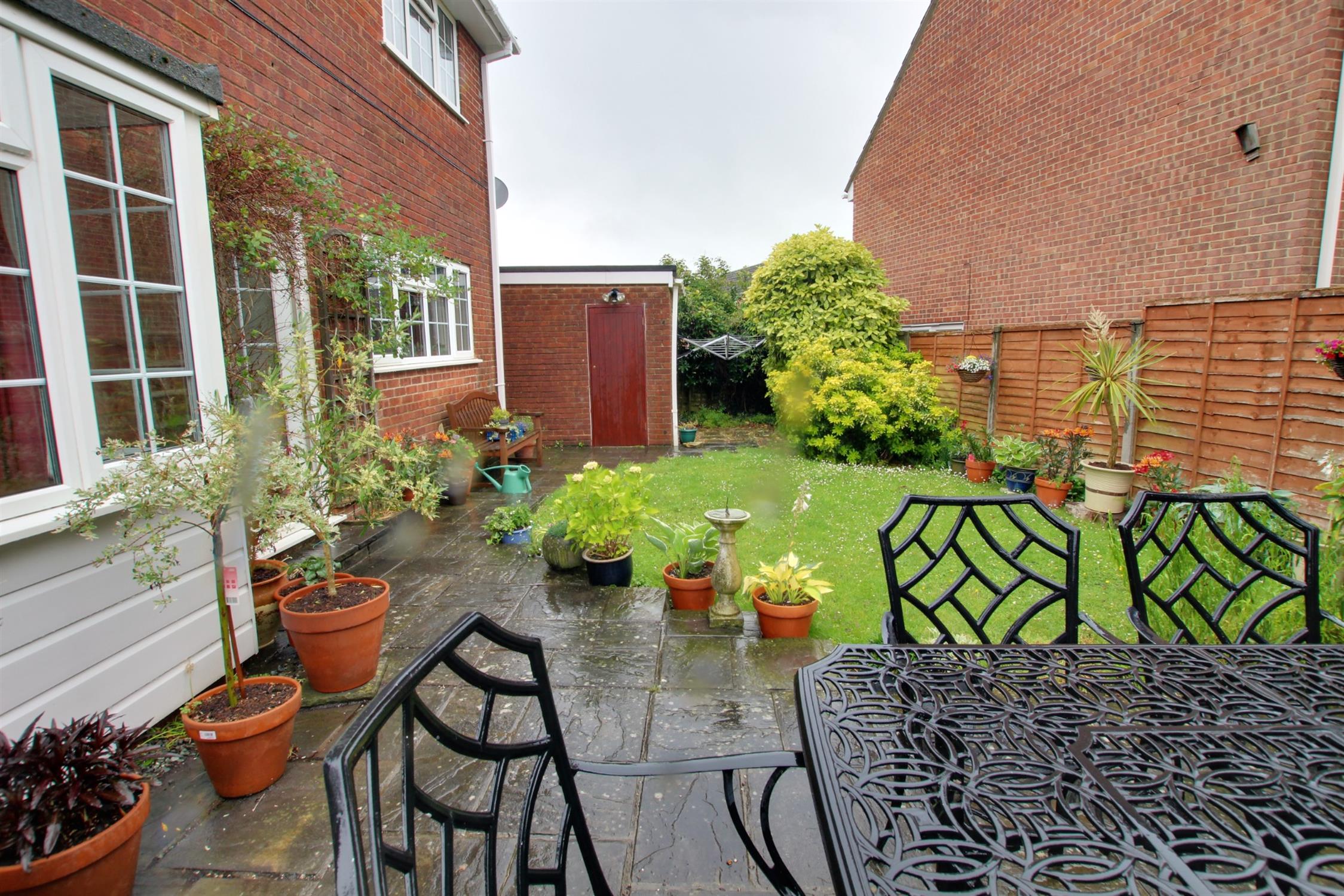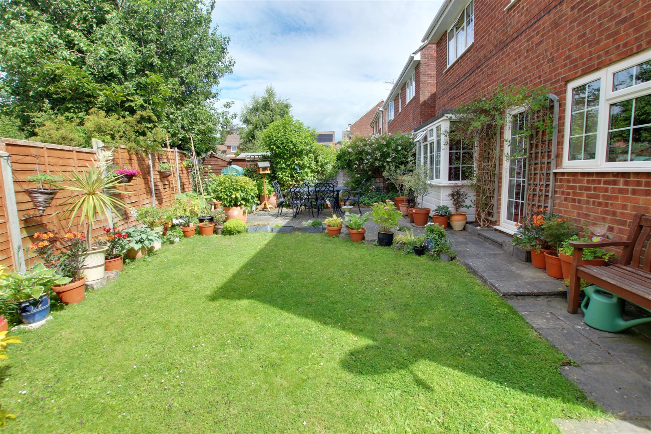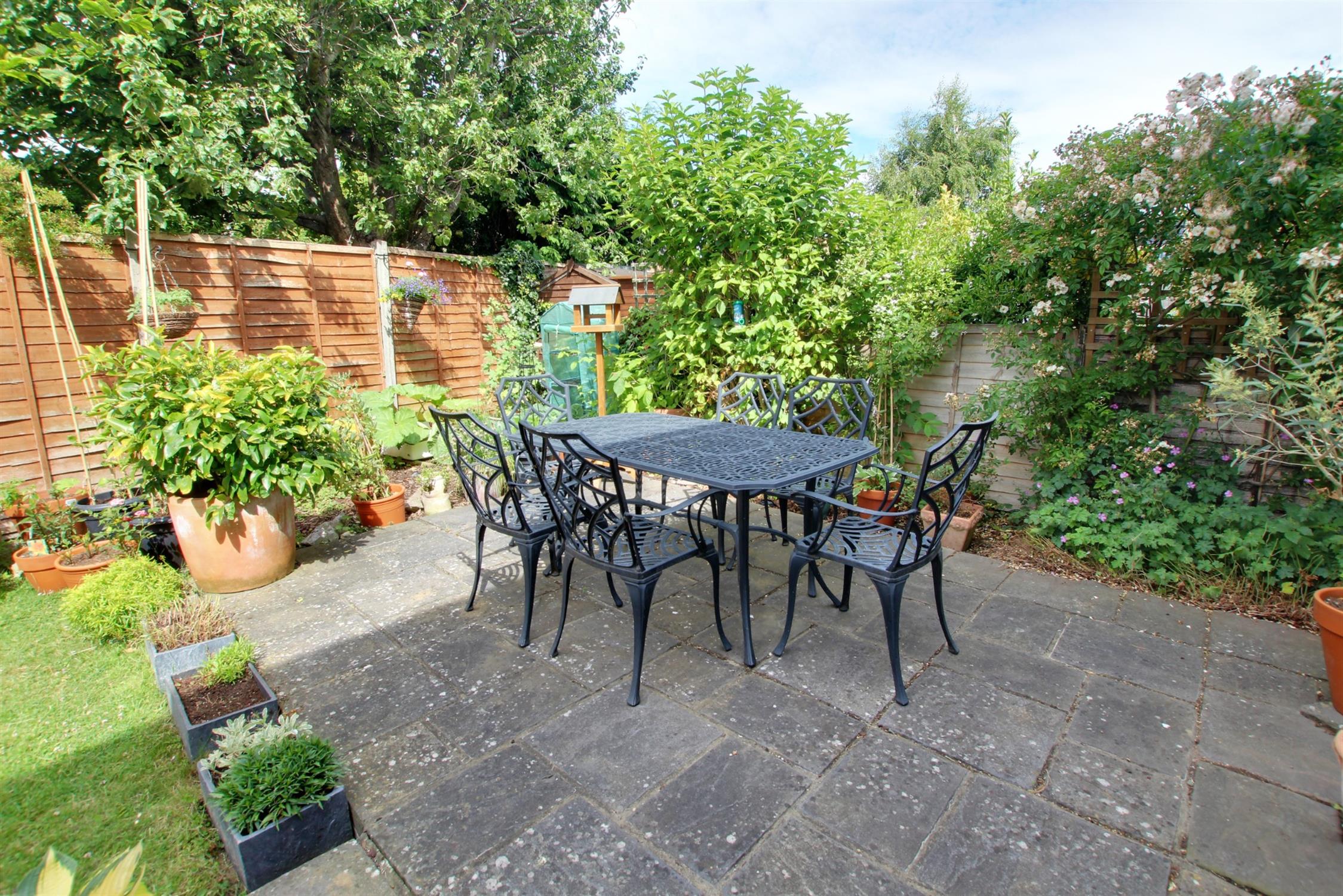 Southerly aspect, timber fence panel enclosed, paved patio and pathway, lawn flowering shrubs.