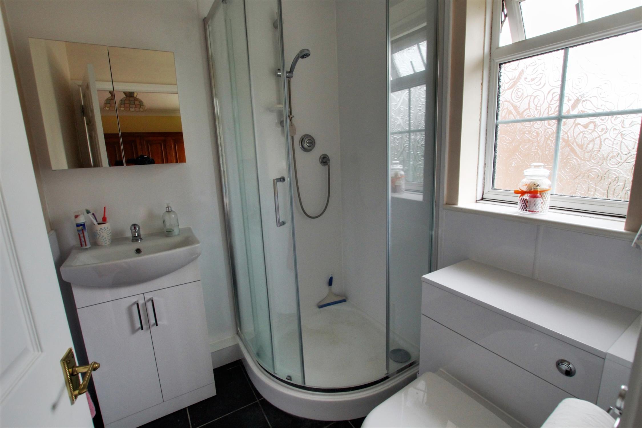 Opaque double glazed window to rear, corner shower cubicle, low level WC, hand basin with vanity storage cupboard, tiled flooring, radiator.