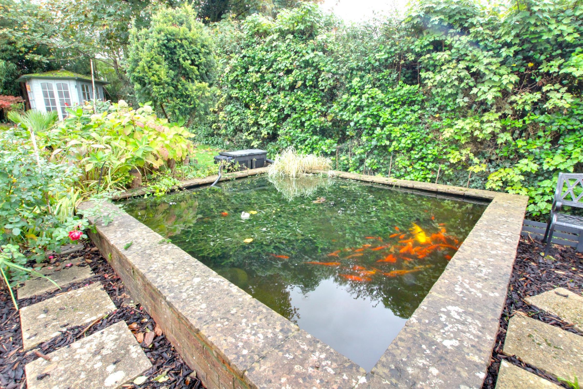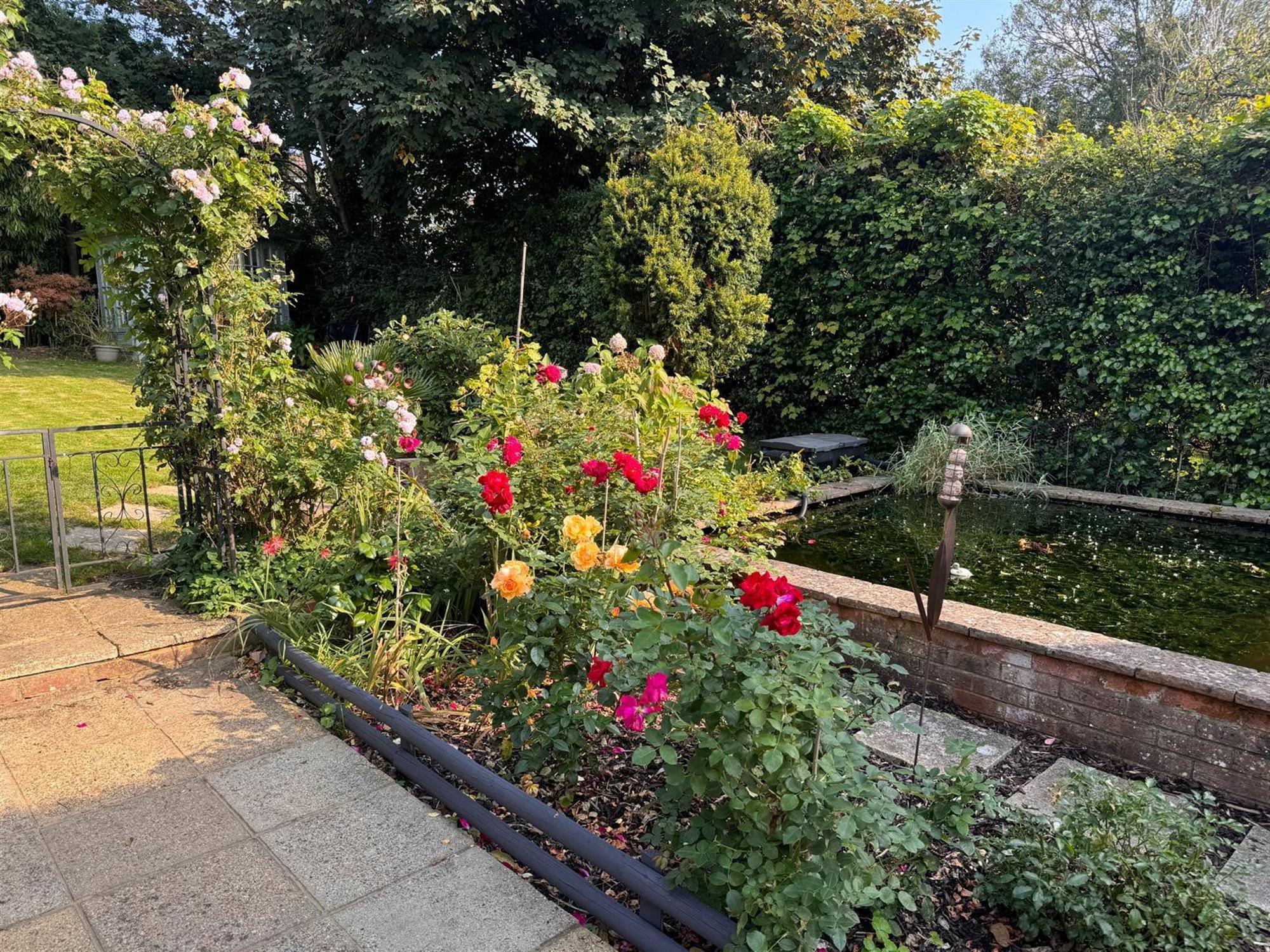 Steps leading up to the brick built pond and seating area opposite, through the rose arbour to an area mainly laid to lawn with a shed, vegetable patch and summer house.
